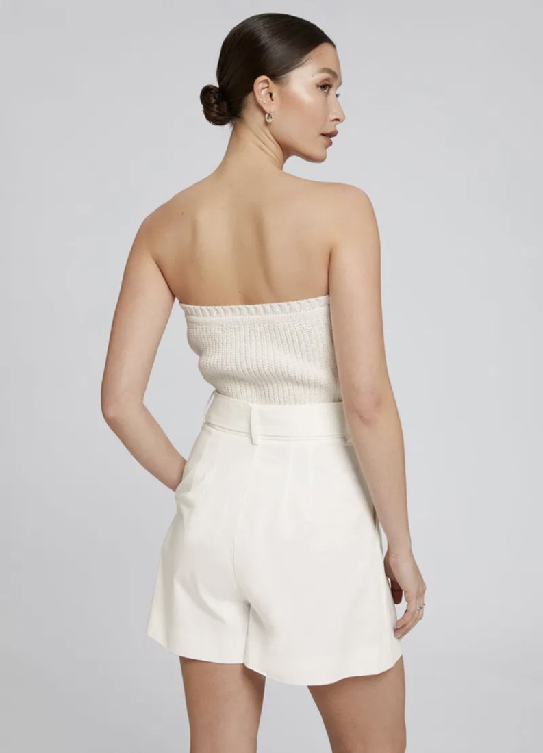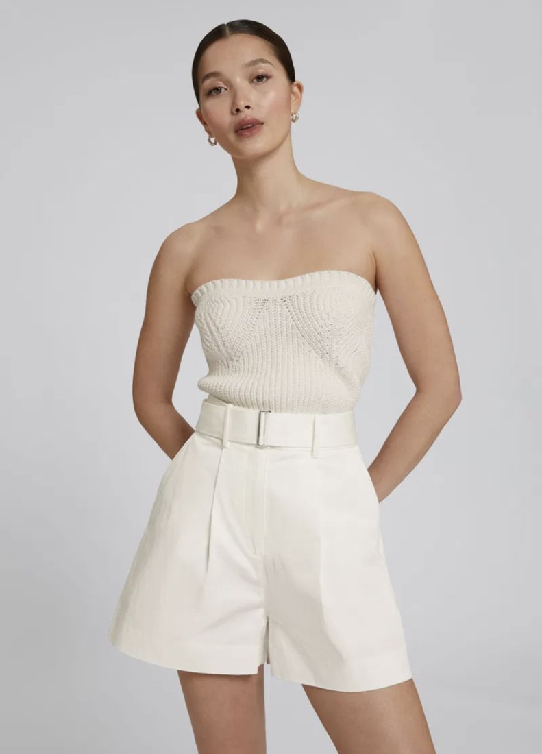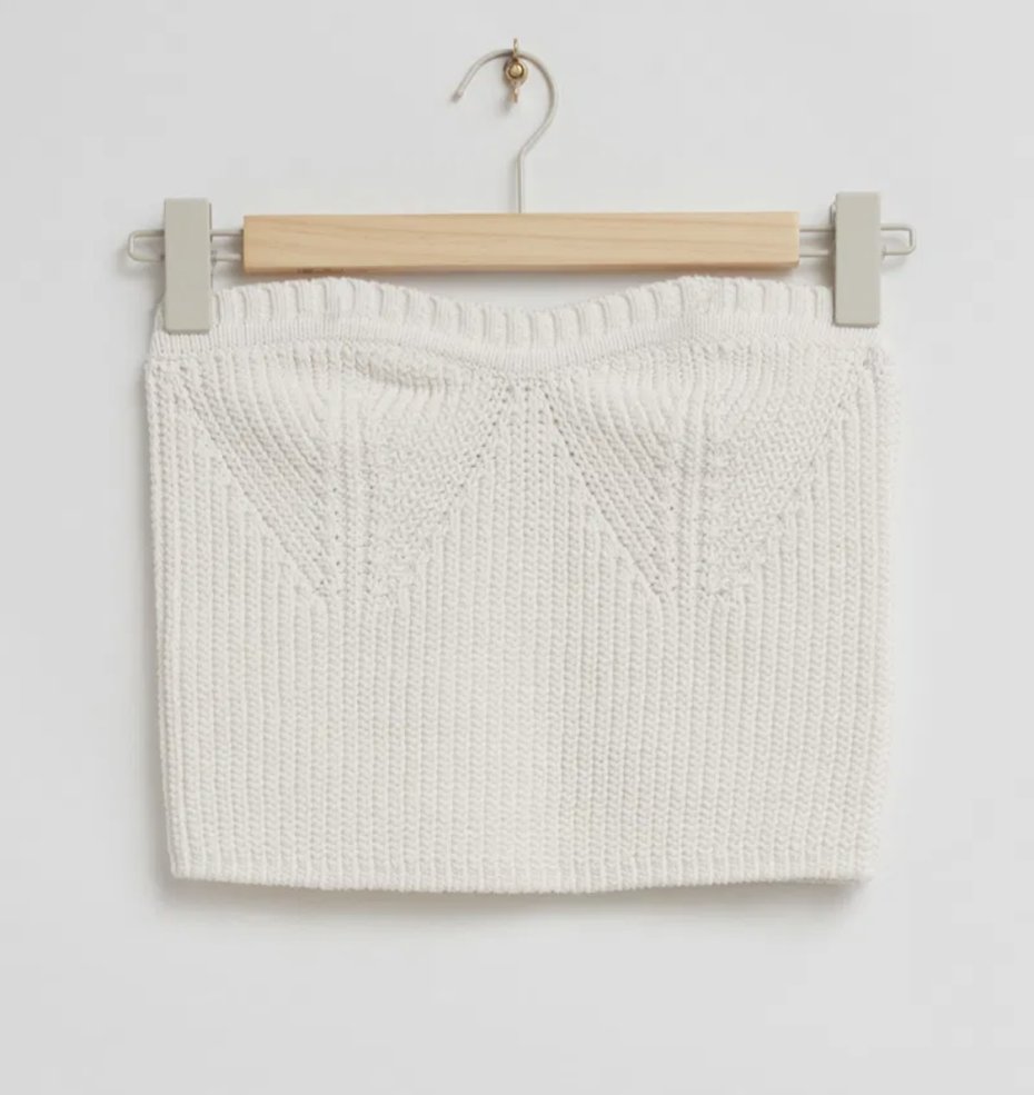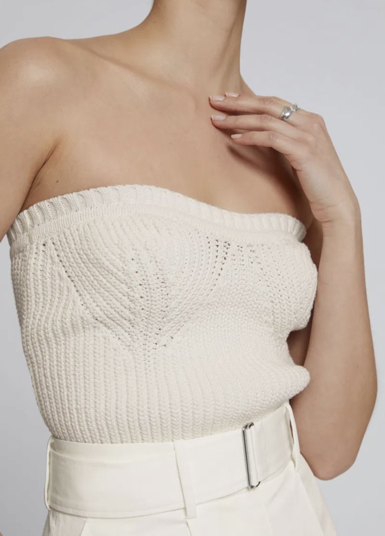 Dzianinowy top tuba typu bandeau wykonany z mieszanki bawełny. Zaprojektowany z dekoltem w kształcie serca bez ramiączek i strukturalnym prążkowanym wykończeniem na całej powierzchni z detalami wokół biustu.