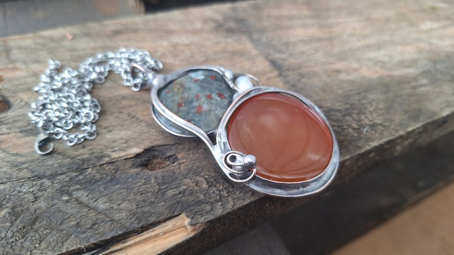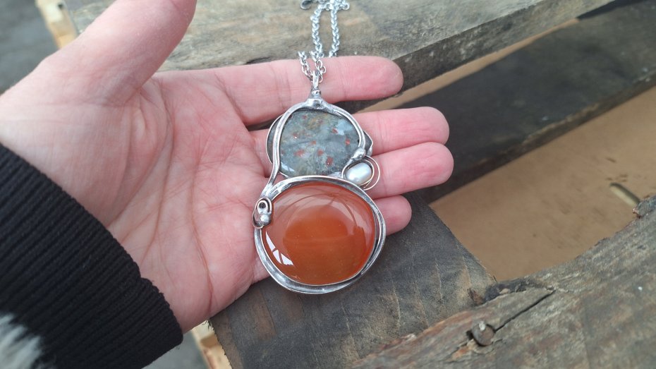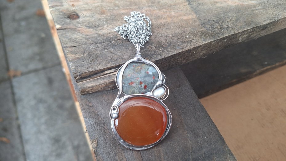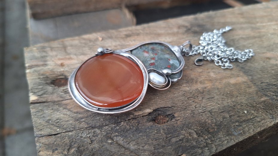Wisiorek wykonany z miedzi, cyny, jaspisu, perły i agatu Wymiary ok. 6.5 na 4 cm. Zawieszony na łańcuszku o długości ok. 50 cm.
