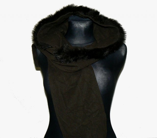 Wełniany otulacz w kolorze ciemnej czekolady, wykończony sztucznym futerkiem.
