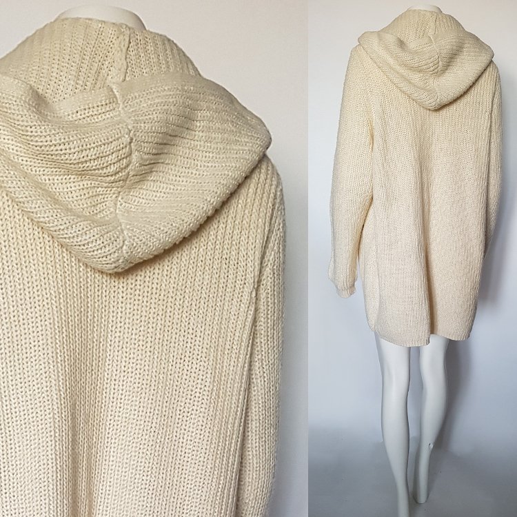Przyjemny, ciepły sweter przed kolano. Wykonany z mięsistej, lejącej dzianiny w kolorze ecru. Góra wykończona kapturem, rękawy długie, z przodu dwie kieszenie nakładane. Sweter bez zapięcia, można nosić luźno jako okrycie, narzutkę, związać paskiem, spiąć agrafką, na życzenie jest też możliwość dorobienia zapięć - prosimy o kontakt przed zakupem.