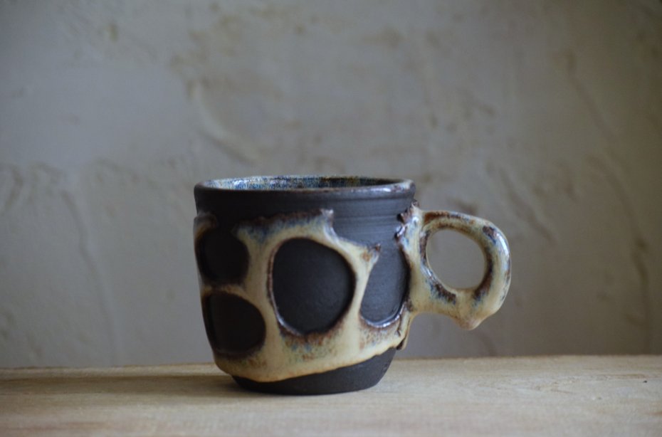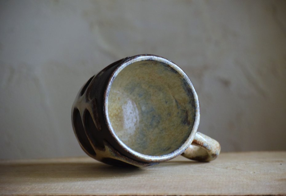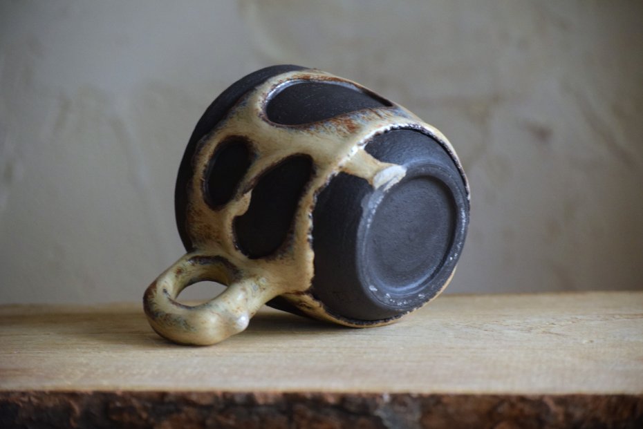 Ten kubek jest wytoczony z czarnej gliny na kole garncarskim, którą częściowo na zewnątrz odsłaniam spod szkliwa. Do środka i na elementy wokół dziur wybrałam kremowe szkliwo z niebieskimi i brązowymi drobinkami. Doszukiwanie się na tym kubku nowych odcieni daje trochę odkrywczej radości;)
