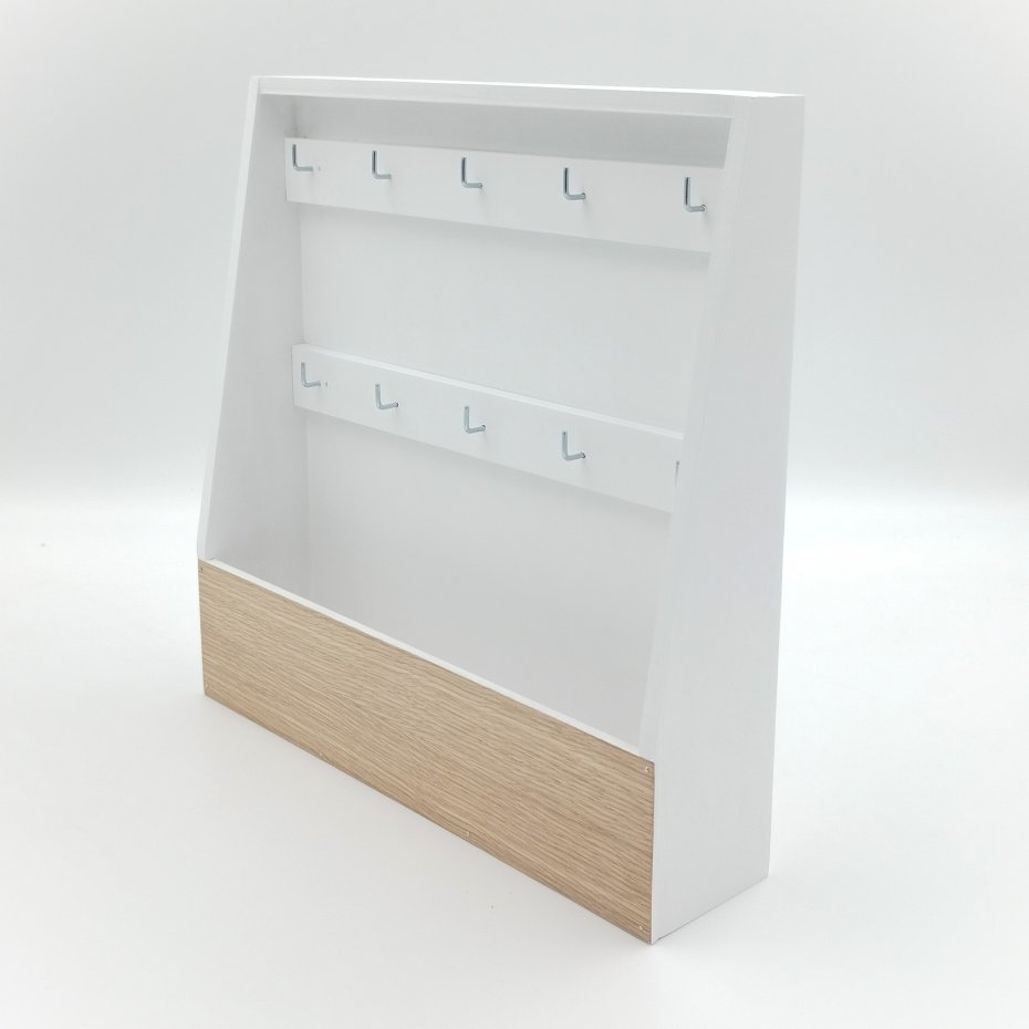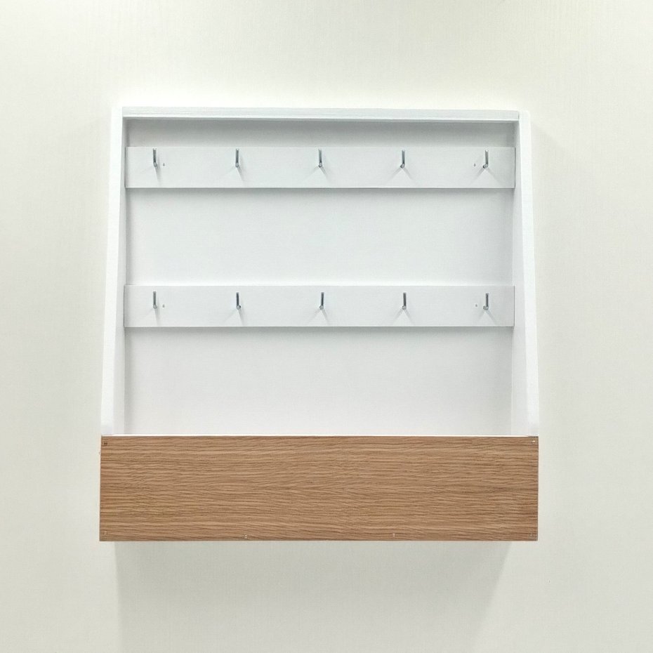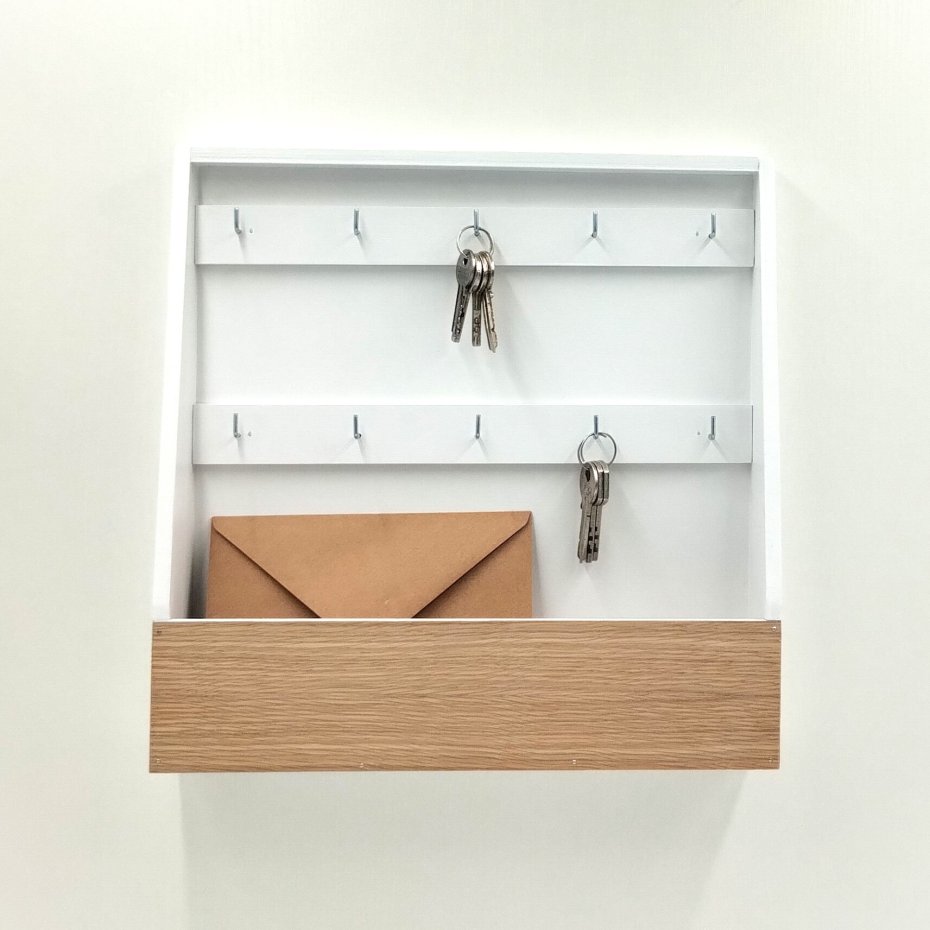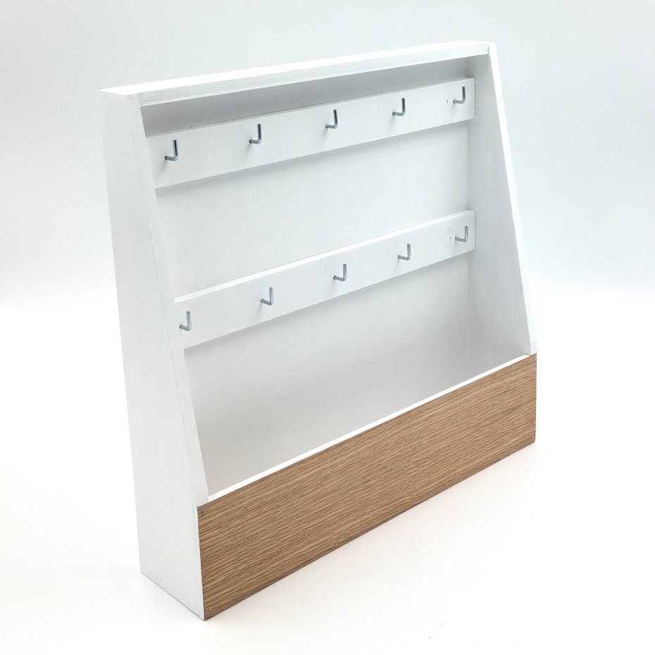Bardzo prosta, praktyczna skrzynka na klucze. Bez drzwiczek, zawsze otwarta. Wieszanie kluczy jest maksymalnie ułatwione. Po prostu sięgasz i masz klucze. W skrzynce znajdują się 2 rzędy po 5 haczyków. W głębokim schowku możesz trzymać dokumenty, paragony i inne drobiazgi. Skrzynka wykonana z drewnianej sklejki i pomalowana na białoo z elementem frontu z naturalnego forniru dębowego. Idealnie pasuje zarówno do nowoczesnych jak i klasycznych wnętrz, holów, warsztatów, pracowni.