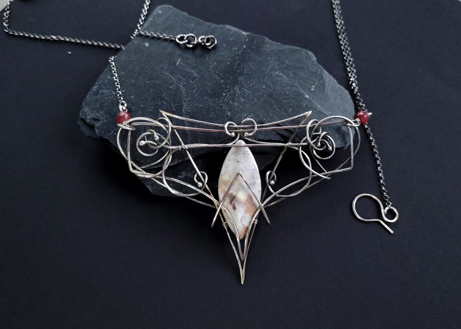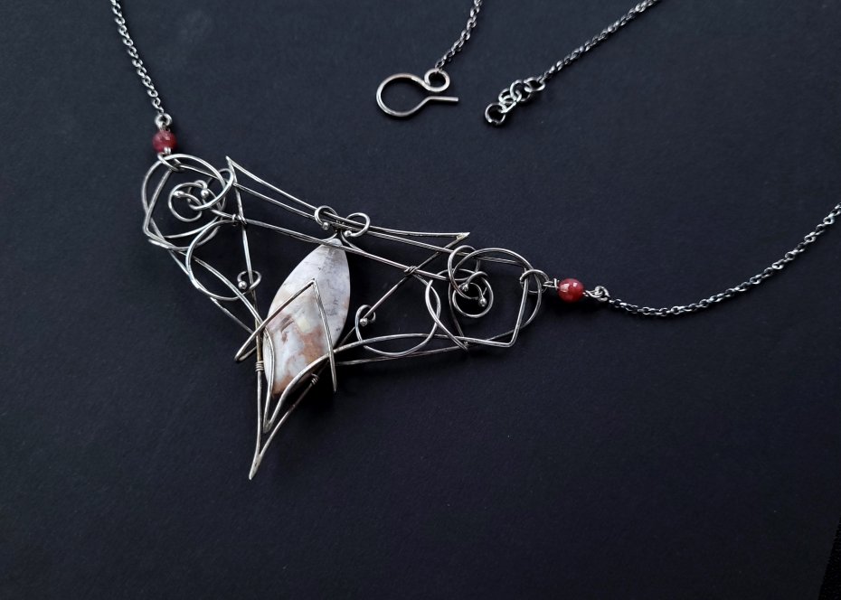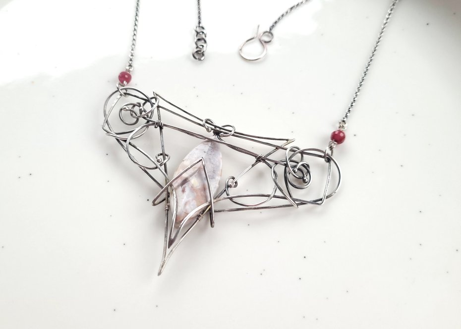 Unikatowy naszyjnik wykonany ręcznie techniką wire wrapping – kunsztowne sploty srebrnego drutu tworzą misterną, elegancką kompozycję z centralnie umieszczonym agatem i drobnymi rubinami po bokach.
