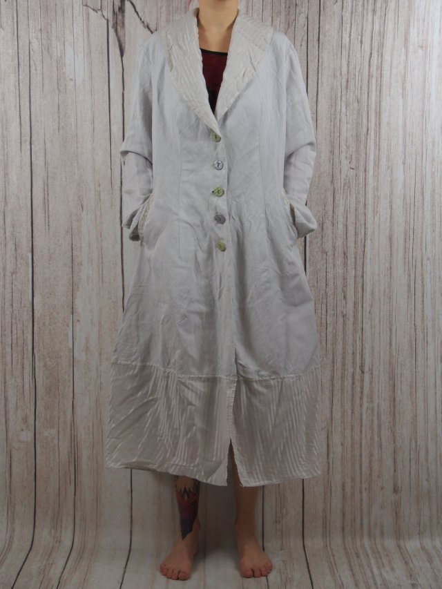 Płaszcz wiosenno-letni Out of Xile (mega droga i ekskluzywna marka) - cena sklepowa w granicach 800-1000zł, Z lnu 50% i wiskozy 50%, dolna część bawełna 60% i acatat 40%.