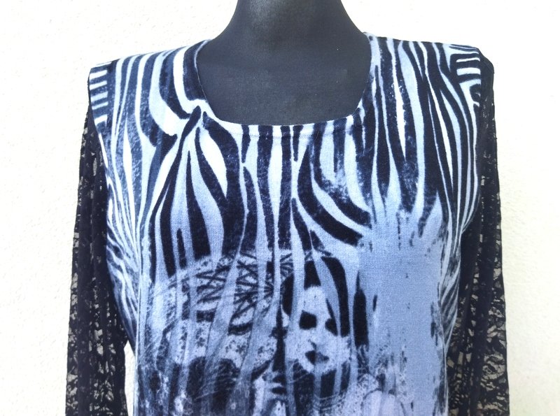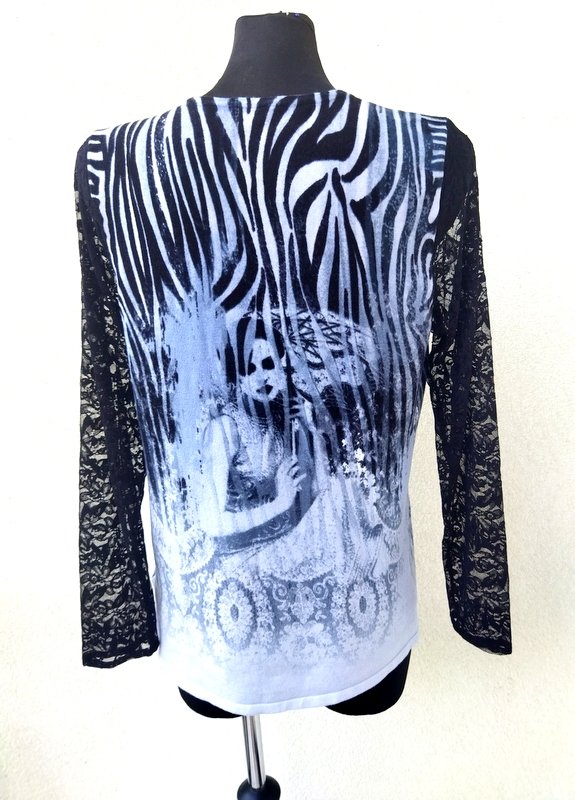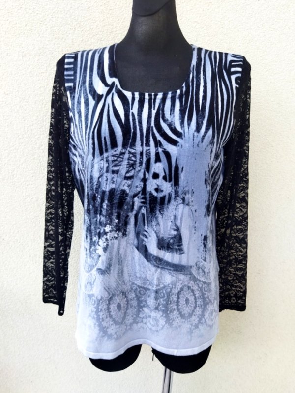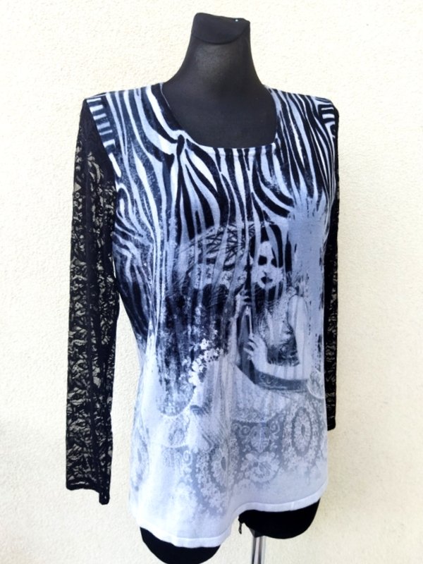 Wiskozowy rozciągliwy sweterek lub bluzka sweterkowa z ciekawym wzorem w kolorystyce odcieni szarości i czerni z rękawami z czarnej koronki. Miły podatny i rozciągliwy.
