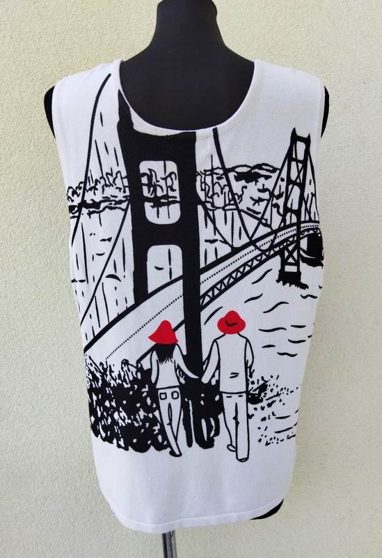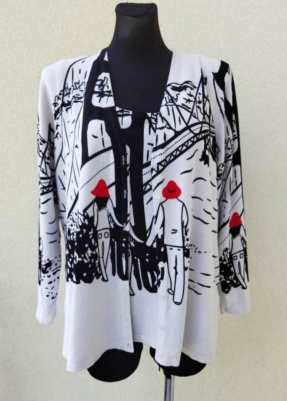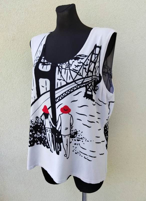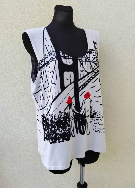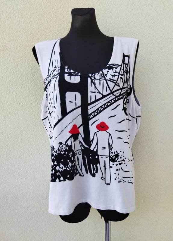 Wiskozowy sweterek bezrękawnik lub bluzka dzianinowa w kolorze jaśniutkiej szarości wpadającej w złamaną biel z ciekawym nadrukiem w kolorystyce czerni z odrobiną czerwieni. Miły , podatny i rozciągliwy