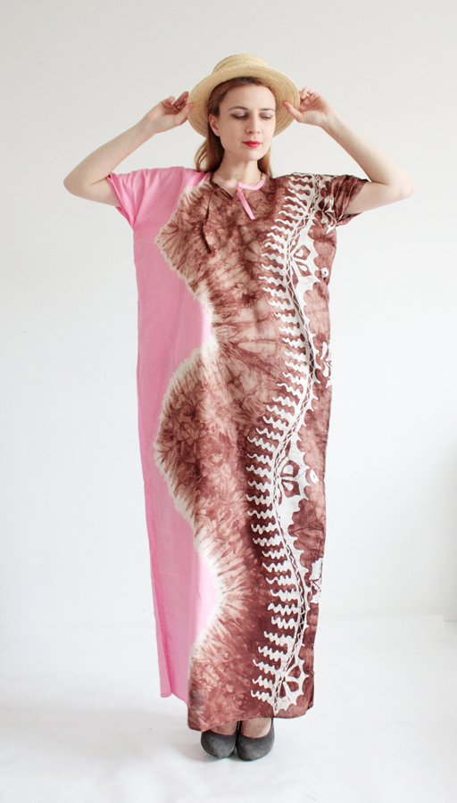 Oryginalna sukienka o swobodnym, oversizowym kroju, która świetnie sprawdzi się w upalne dni, na plażę, jak również do chodzenia po domu o każdej porze roku. Materiał to prawdopodobnie bawełna.