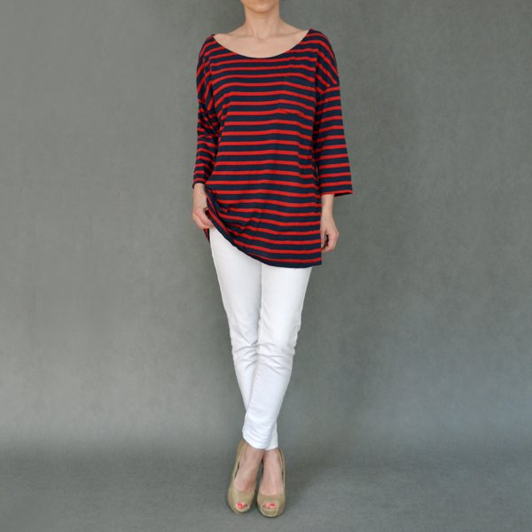 Casualowa bluzeczka w czerwone i granatowe paski. Krój oversize. Marka H&M. Na piersi kieszonka.