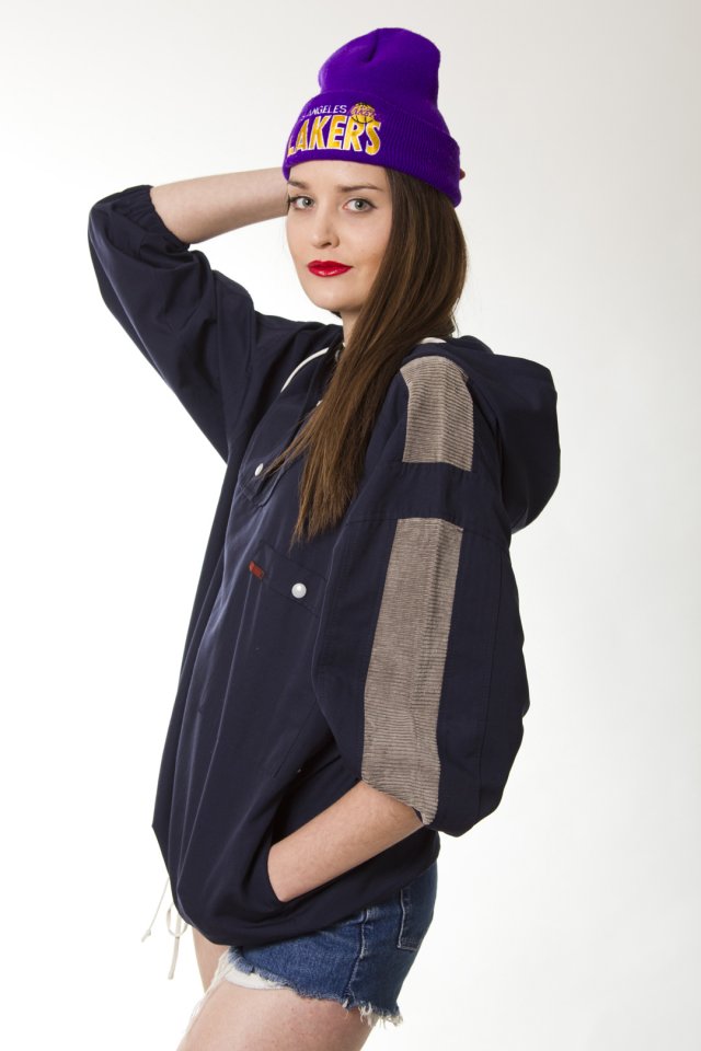 Ciemnogranatowa oversizowa kurtka uniseks z kapturem oraz sztruksowymi wstawkami na rękawach. Na dole można regulować szerokość. Wkładana przez głowę, zapinana na plastikowe zatrzaski. Kurtka posiada dwie kieszonki po bokach oraz jedną na piersi.