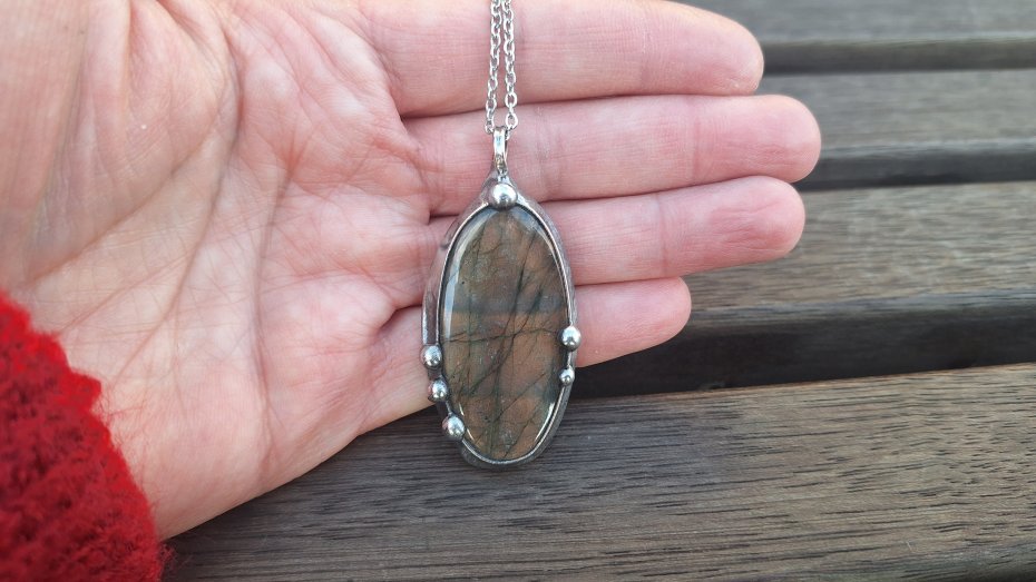 Wisiorek wykonany z miedzi, cyny i labradorytu. Wymiary ok. 4.5 na 2.5 cm. Zawieszony na łańcuszku o długości ok. 50 cm.