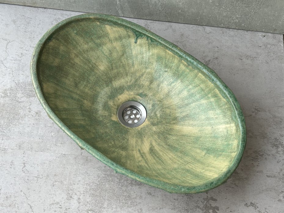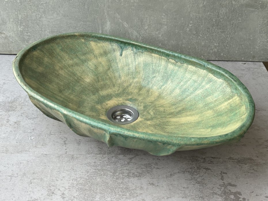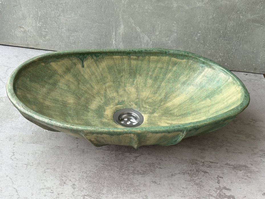 Ręcznie formowana od podstaw umywalka ceramiczna o charakterystycznym asymetrycznym i nieregularnym kształcie. Jej powierzchnia została pokryta zielono‑żółtą glazurą o błyszczącym wykończeniu, tworzącą naturalne przejścia kolorów i podkreślającą ręczne wykonanie. Umywalka została wykonana z ceramiki wypalanej w wysokiej temperaturze, dzięki czemu jest trwała i odporna na codzienne użytkowanie. Doskonale sprawdzi się w łazienkach urządzonych w stylu naturalnym, rustykalnym, boho lub japandi, szczególnie w połączeniu z drewnem, kamieniem lub betonem. Wypalona w temperaturze powyżej 1200 stopni zapewni trwałość, odporność na wilgoć a także najważniejsze na detergenty.