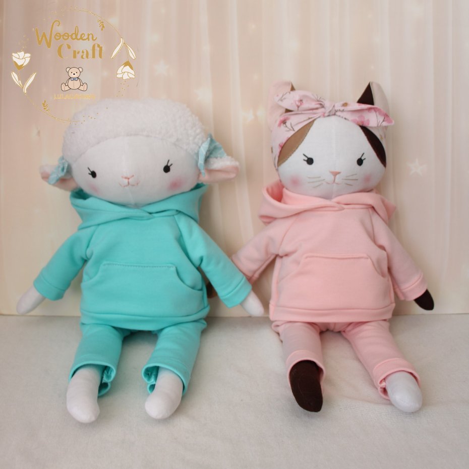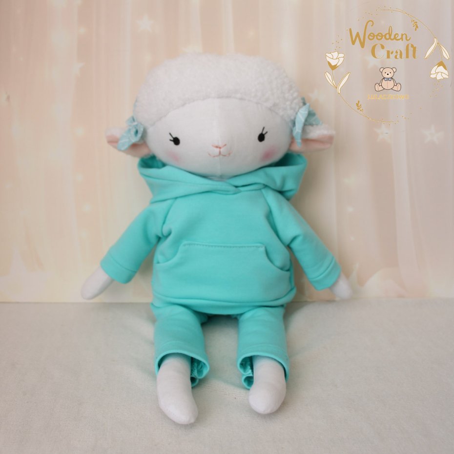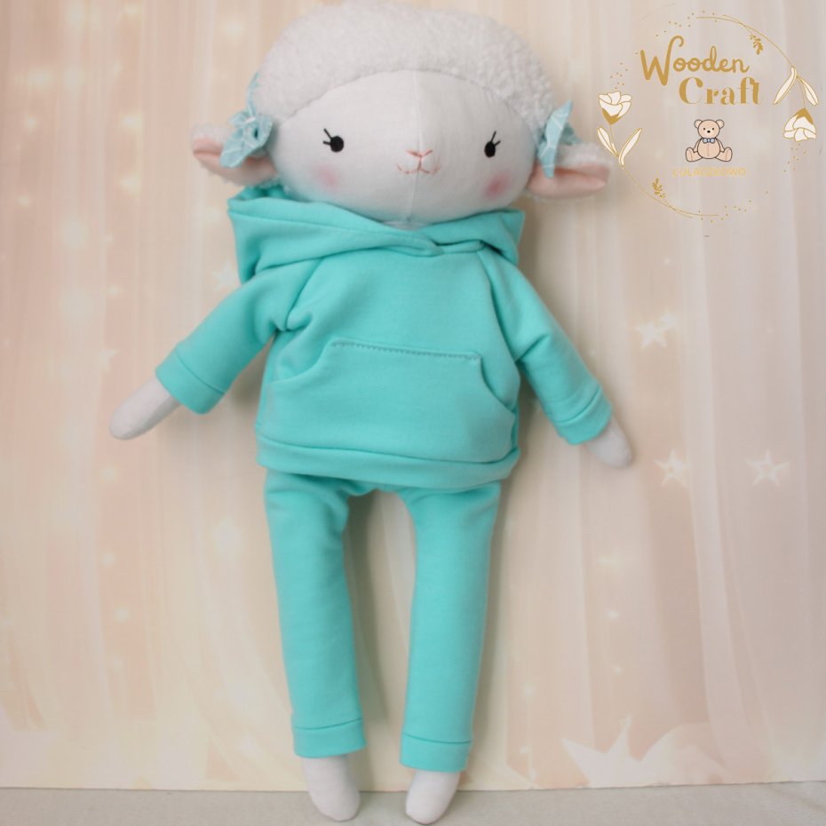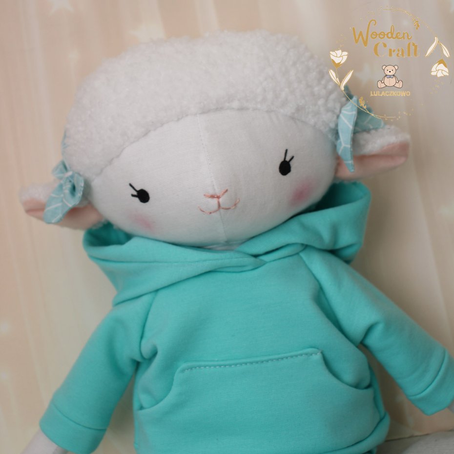 Przeurocza przytulanka, owieczka cała w bieli, uszyta ręcznie z najwyższą starannością, ubrana w miętowy dresik z kapturem. Wykonana ze 100% bawełny, wypełniona antyalergiczną kulką silikonową. Oczka malowane wodoodpornym markerem, nosek i uśmiech wyszyte muliną, uszka ozdobione kokardkami. Dresik można swobodnie zdejmować, spodenki posiadają w pasie gumeczkę. Górne i dolne łapki układają się luźno, owieczka siedzi z podparciem.