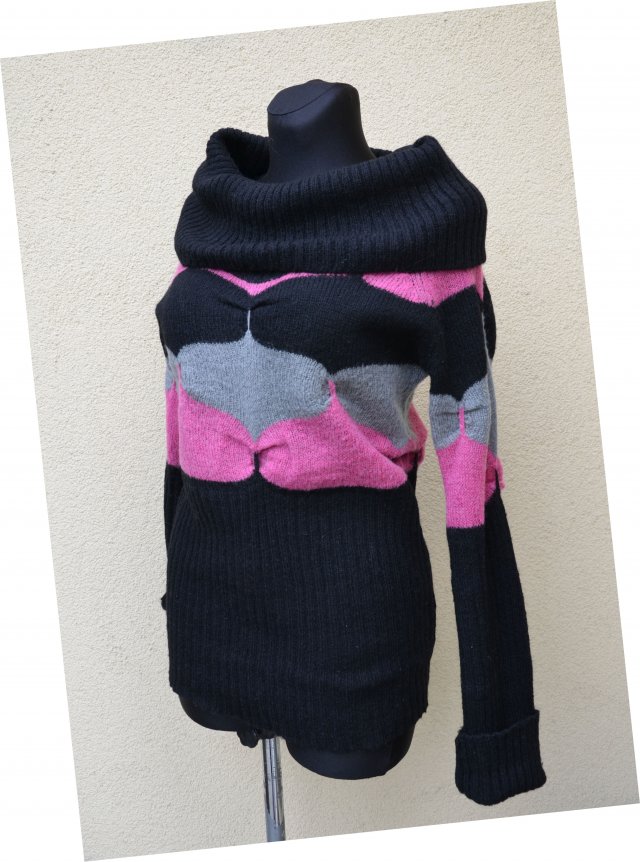 Oryginalny sweterek marki OWN WAY. Moherowy. Duży, wywijany dekolt. Ściągacz na rękawach, można je również wywijać. Czarno-różowo-szary. Materiał bardzo elastyczny.