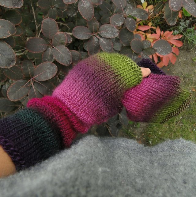Ozdoba i ochrona przed chłodem - ciepłe mitenki wykonane na drutach z milutkiej w dotyku włóczki ( 100% akryl premium) - bezszwowe, długość ok. 29 cm. Polecam. Ze względu na układ barw - pojedynczy egzemplarz.