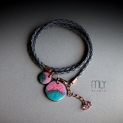 Efektowna bransoletka wykonana z rzemienia jubilerskiego, elementów w kolorze miedzi i ręcznie wykonanej ceramicznej zawieszki, szkliwionej błyszczącym różowo zielonkawym szkliwem, Obwód regulowany, długość elementu ceramicznego ok 1,8cm. Polecam . Termin realizacji zamówienia to 1-2 dni..