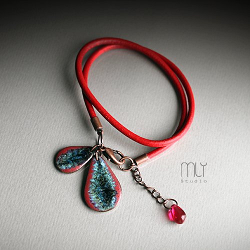 Efektowna bransoletka wykonana z rzemienia jubilerskiego, elementów w kolorze starego złota i ręcznie wykonanej ceramicznej zawieszki, szkliwionej czerwono zielonym szkliwem, Obwód regulowany, długość elementu ceramicznego ok 2,4 i 1,5cm. Polecam . Termin realizacji zamówienia to 1-2 dni. Termin realizacji zamówienia to 1-2 dni.