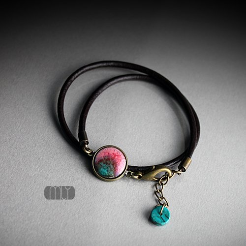 Efektowna bransoletka wykonana z rzemienia jubilerskiego, elementów w kolorze starego złota i ręcznie wykonanej ceramicznej zawieszki, szkliwionej mieszanką zielonych i różowych szkliw z efektem plamek o subtelnym połysku, Obwód regulowany. Polecam