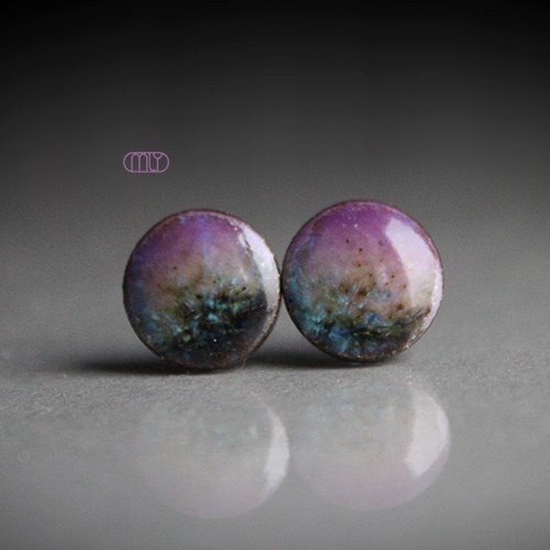 Ceramiczne okrągłe kolczyki w formie sztyftów, ręcznie wykonane z delikatnej czekoladowobrązowej gliny kamionkowej, jednostronnie szkliwione mieszanką różowych i zielonych szkliw z efektem plamek, na antyalergicznych sztyftach w kolorze srebrnym. Średnica ok. 11mm.