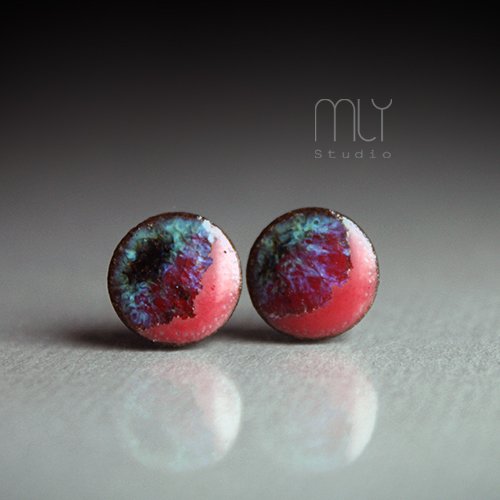 Okrągłe, lekko nieregularne ceramiczne kolczyki w formie sztyftów, ręcznie wykonane z delikatnej czekoladowobrązowej gliny kamionkowej, jednostronnie szkliwione mieszanką zielonkawo czerwonych szkliw z efektem plamek i subtelnym połyskiem, na antyalergicznych sztyftach w kolorze srebrnym. Średnica ok. 9mm.Polecam