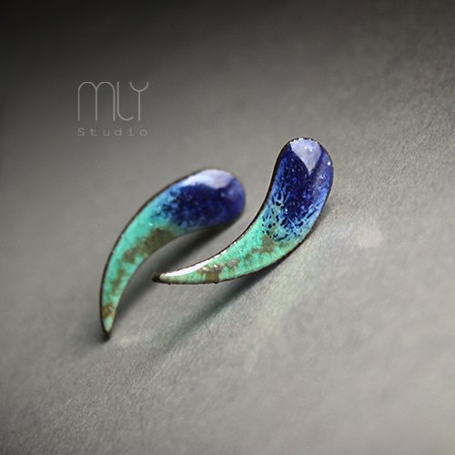 Ceramiczne podłużne kolczyki, ręcznie wykonane z delikatnej gliny kamionkowej, jednostronnie szkliwione mieszanką zielonych i błękitnych szkliw z efektem plamek, tył matowy czekoladowobrązowy na antyalergicznych sztyftach.długość ok 2,8cm. Polecam