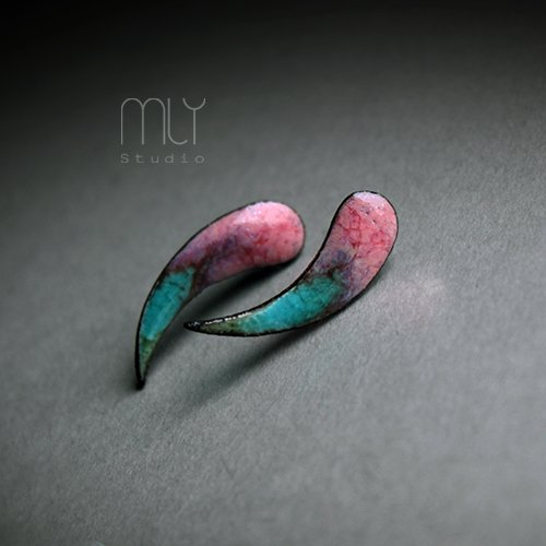 Ceramiczne podłużne kolczyki, ręcznie wykonane z delikatnej gliny kamionkowej, jednostronnie szkliwione mieszanką zielonych i różówych szkliw z efektem plamek, tył matowy czekoladowobrązowy na antyalergicznych sztyftach.długość ok 2,8cm. Polecam