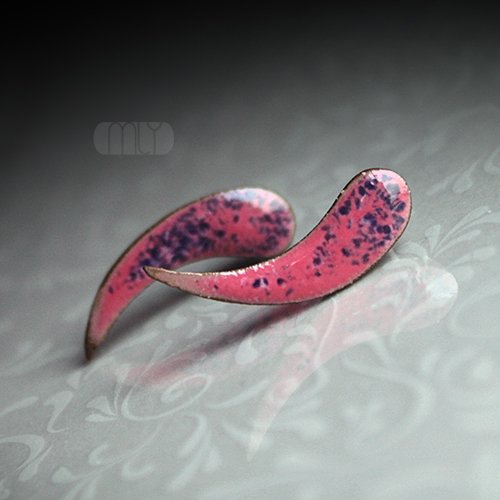 Ceramiczne podłużne kolczyki, ręcznie wykonane z delikatnej gliny kamionkowej, jednostronnie szkliwione mieszanką różówych szkliw z efektem plamek, tył matowy czekoladowobrązowy na antyalergicznych sztyftach.długość ok 2,8cm. Polecam