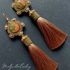 Ceramiczne podłużne kolczyki, ręcznie wykonane z delikatnej gliny kamionkowej, jednostronnie szkliwione mieszanką zielonych i błękitnych szkliw z efektem plamek, tył matowy czekoladowobrązowy na antyalergicznych sztyftach.długość ok 2,8cm. Polecam