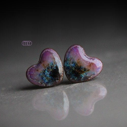 Ceramiczne okrągłe kolczyki w formie sztyftów, ręcznie wykonane z delikatnej czekoladowobrązowej gliny kamionkowej, jednostronnie szkliwione mieszanką zielonych i fioletowych szkliw z efektem plamek, na antyalergicznych sztyftach w kolorze srebrnym. Średnica ok. 11mm.