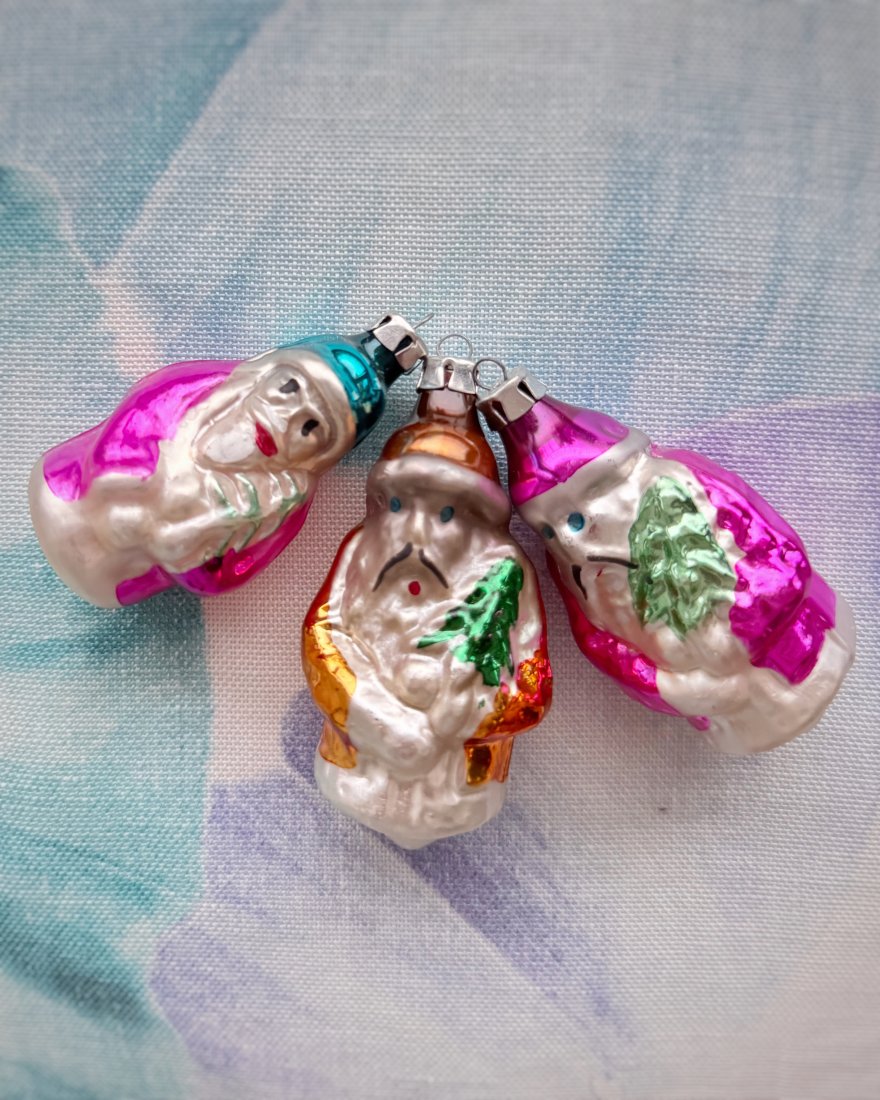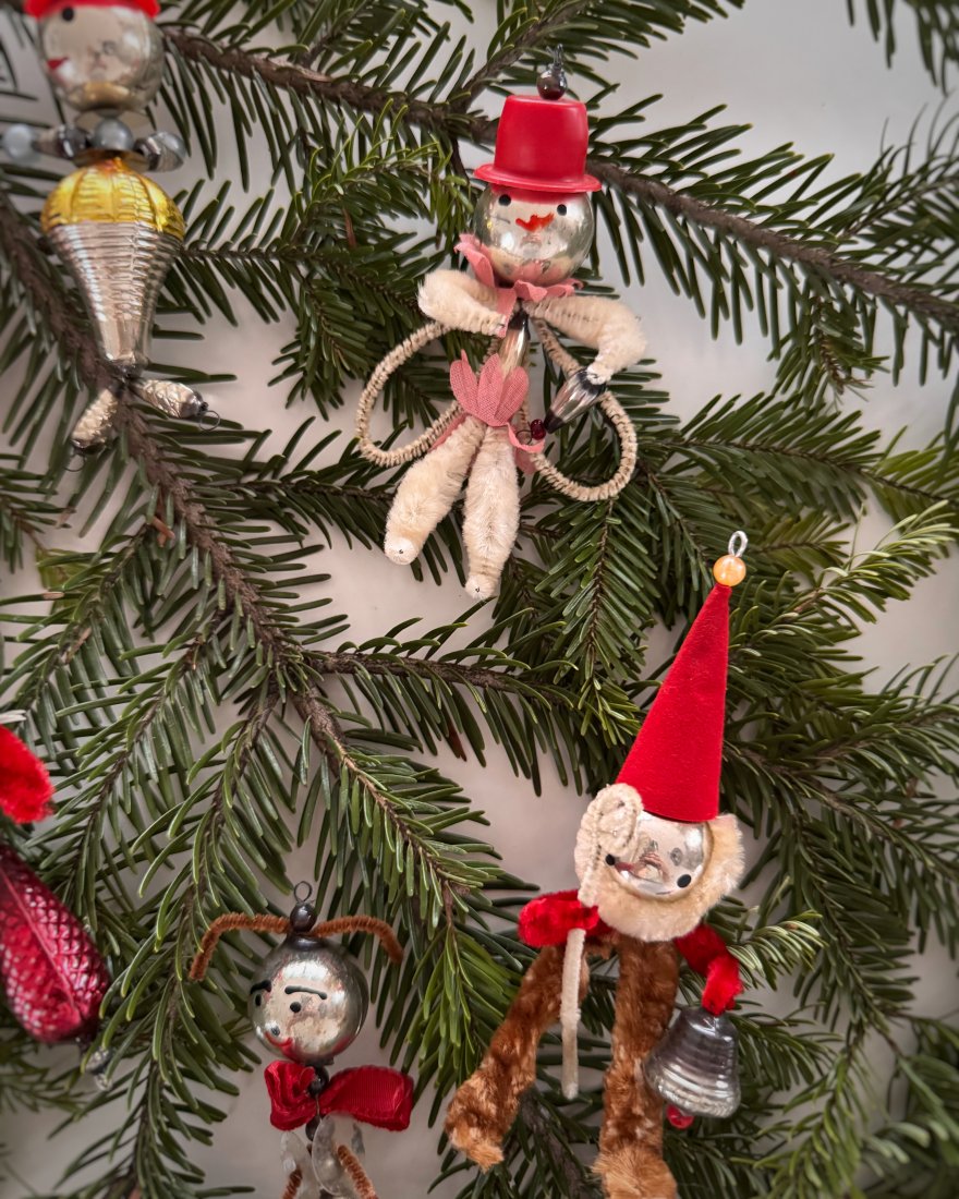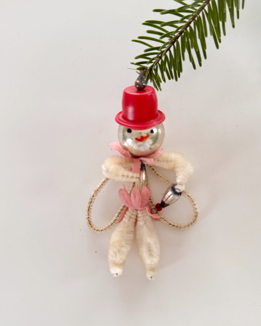 Ozdoba choinkowa w kształcie ludzika wykonana ręcznie na bazie bombek, koralików, drucików ozdobnych i innych detali oraz ręcznie malowana.