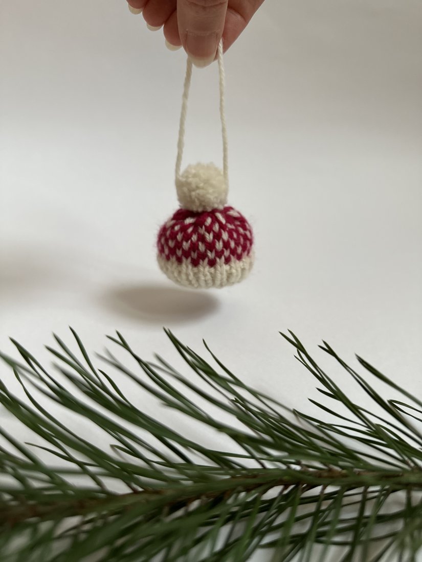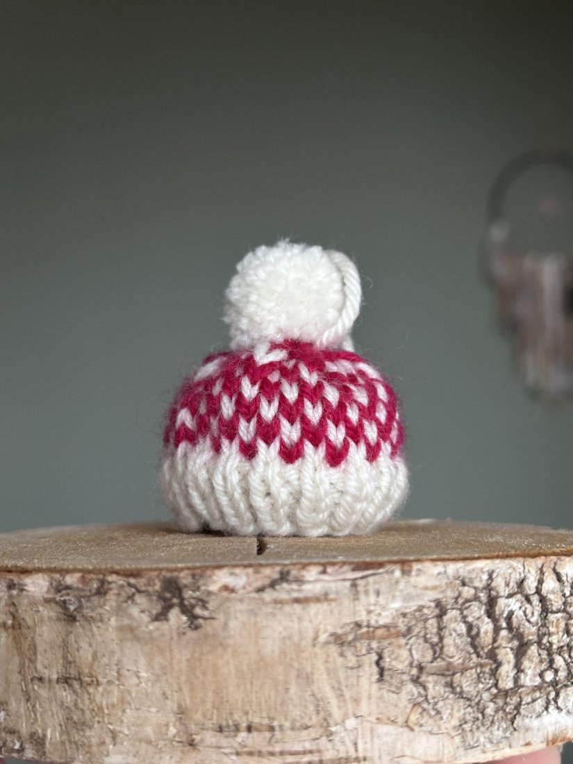 Ozdoba choinkowa mini-czapeczka, wykonana ręcznie na drutach z naturalnej włóczki składającej się z wełny owczej.