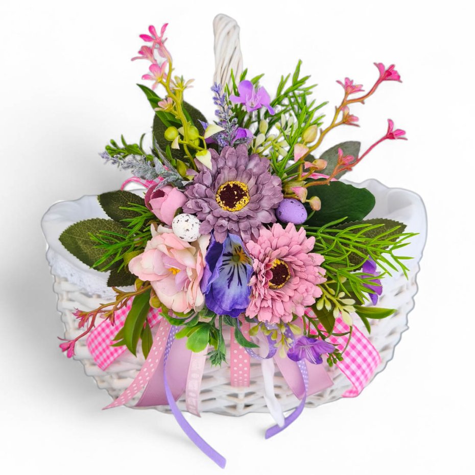 Wielkanocna, kwiatowa ozdoba do przymocowania na koszyczek.