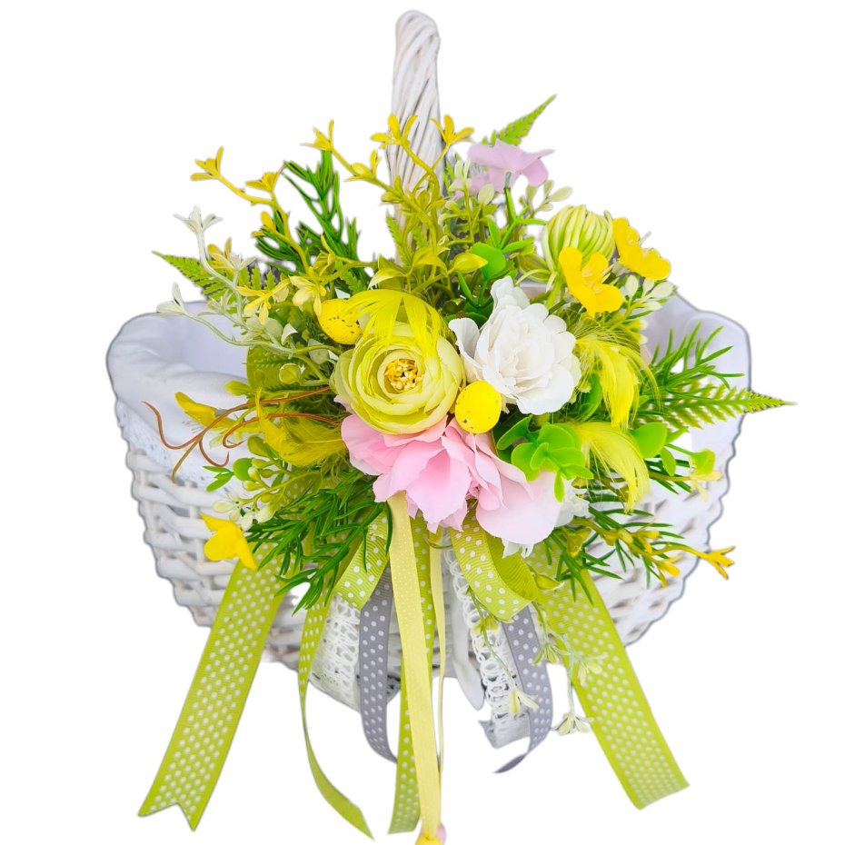 Wielkanocna, kwiatowa ozdoba do przymocowania na koszyczek.