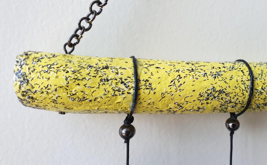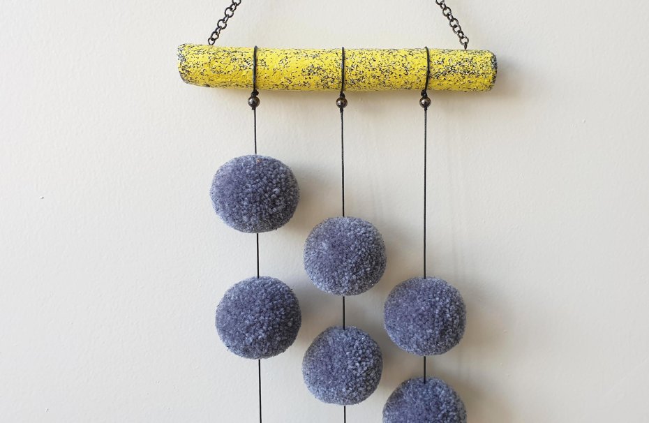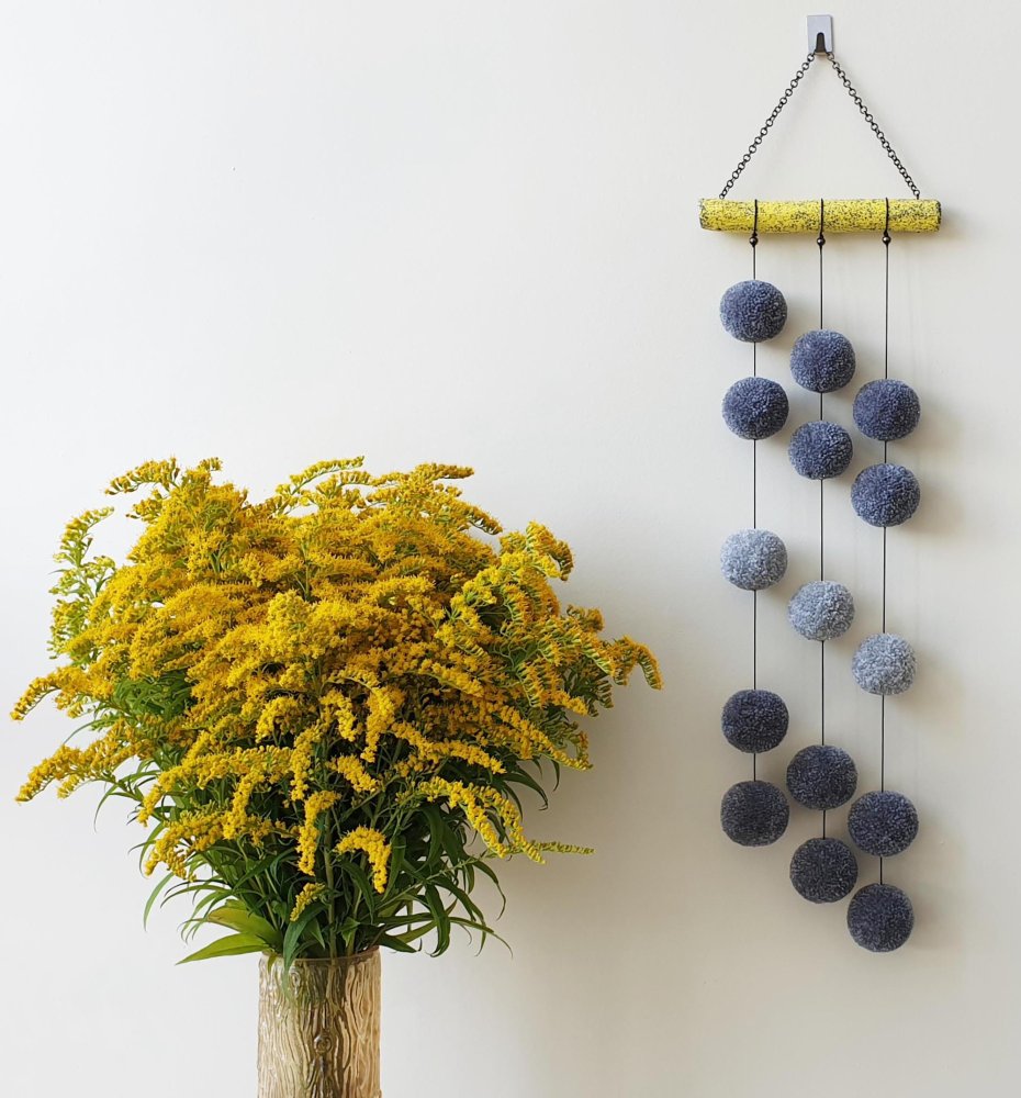 Ta oryginalna ozdoba z miękkich, szarych pomponów zawieszonych na żółtym patyku to połączenie spokoju i energii, delikatności i charakteru.