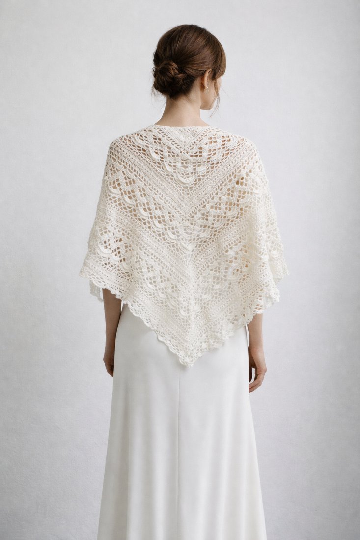 Ta chusta na ślub pasuje zarówno do klasycznych, jak i nowoczesnych stylizacji. Można założyć ją na ceremonię, przyjęcie weselne, a po ślubie nosić również na co dzień — jako elegancki szal lub chustę handmade do sukienek i płaszczy.