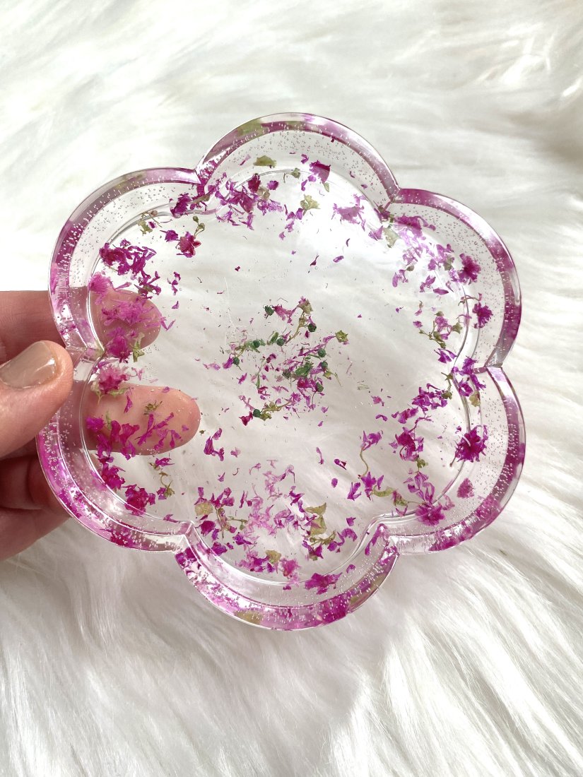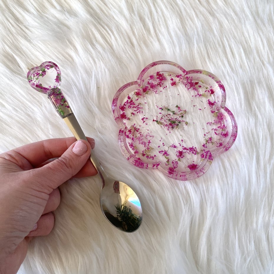 Piękna podstawka z żywicy epoksydowej, ozdobiona prawdziwymi, suszonymi kwiatami w komplecie z ozdobną łyżeczką. Każdy egzemplarz jest unikatowy, ponieważ kwiaty układają się w niepowtarzalny wzór. Podstawka i łyżeczka stanowią elegancki element nakrycia stołu i pasują także do Twojego ulubionego kubka.
