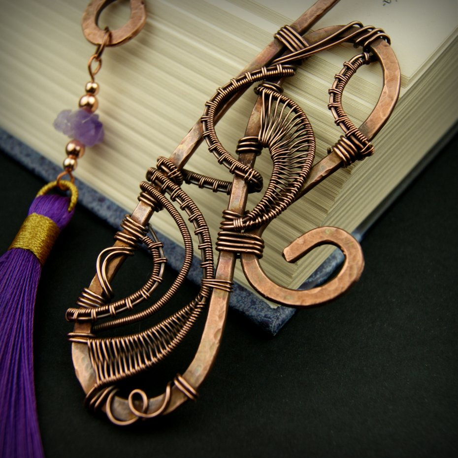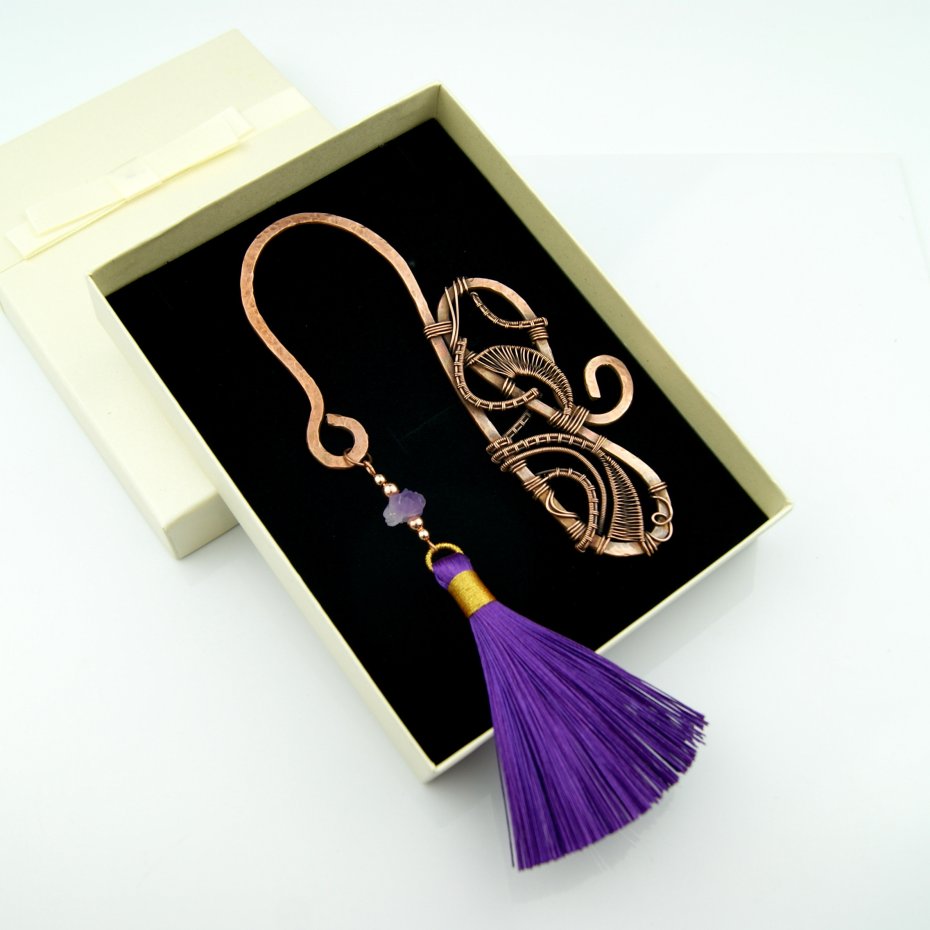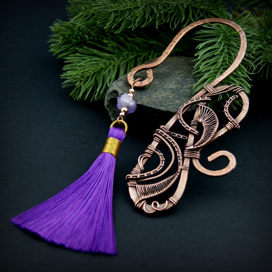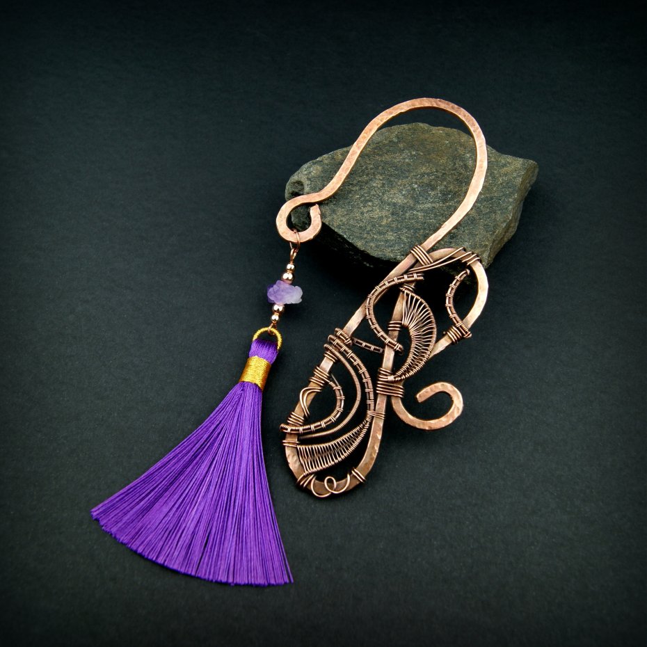 Jedyna w swoim rodzaju zakładka do książki wykonana w pracochłonnej technice wire wrapping. Zakładka wykonana z fakturowanej miedzi, z misternym oplotem. Ozdobna przywieszka z długim wiskozowym chwostem w kolorze fioletowym oraz kamieniami: ametystem i hematytem. Całkowita długość zakładki (razem z chwostem) to 19 cm.
