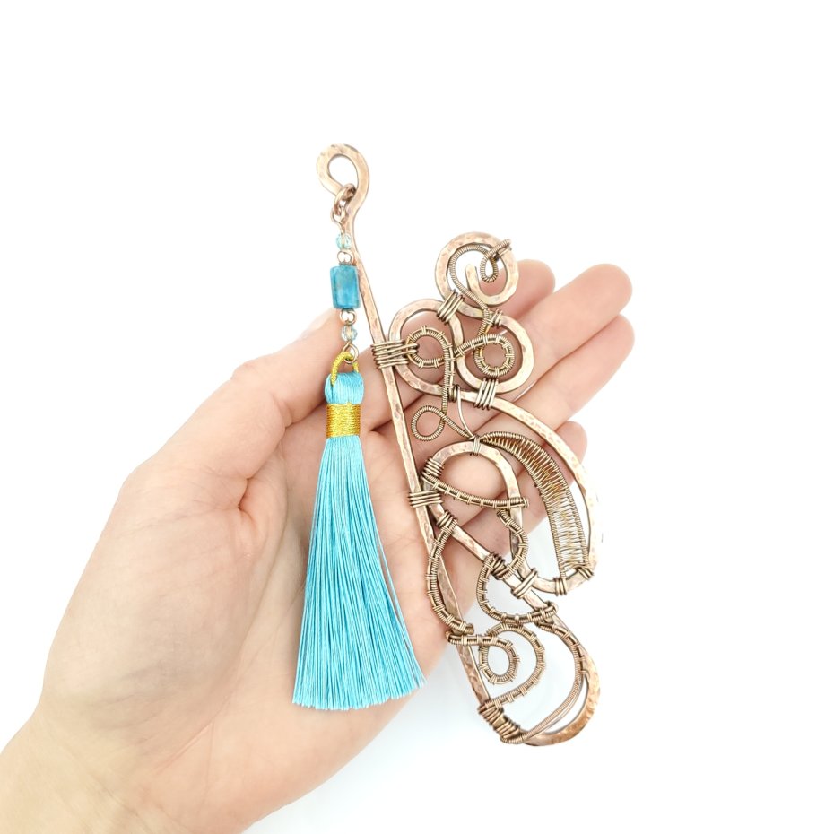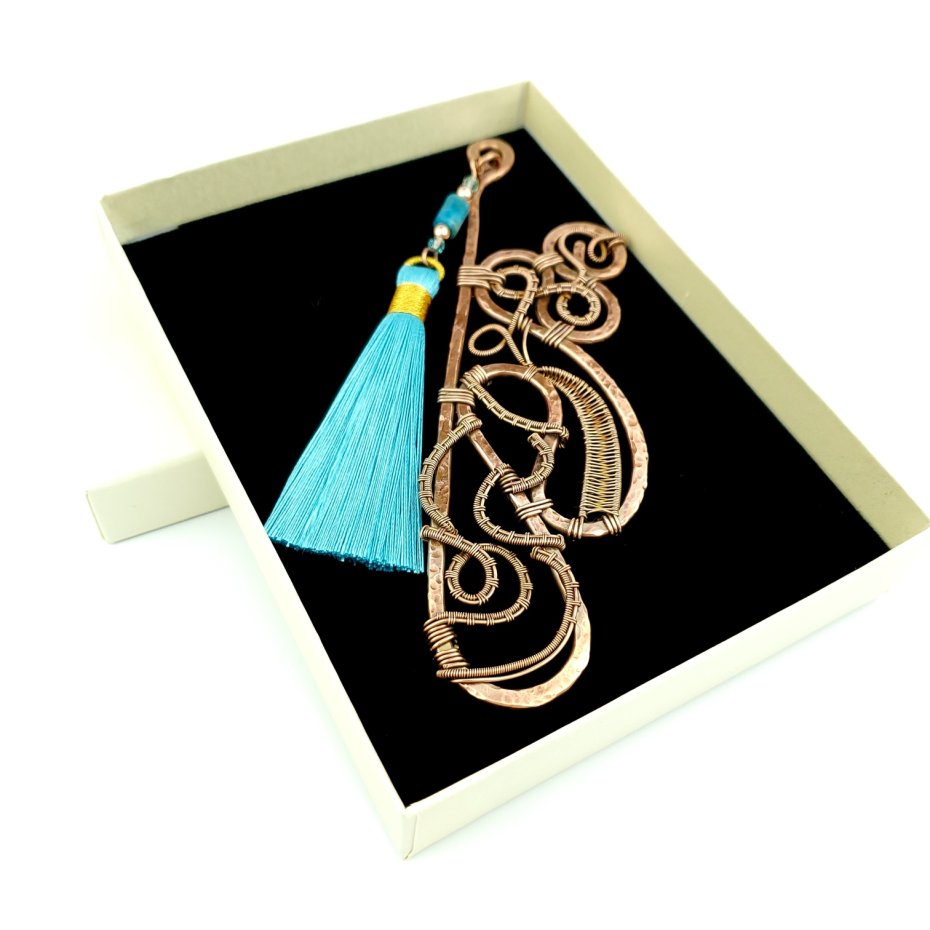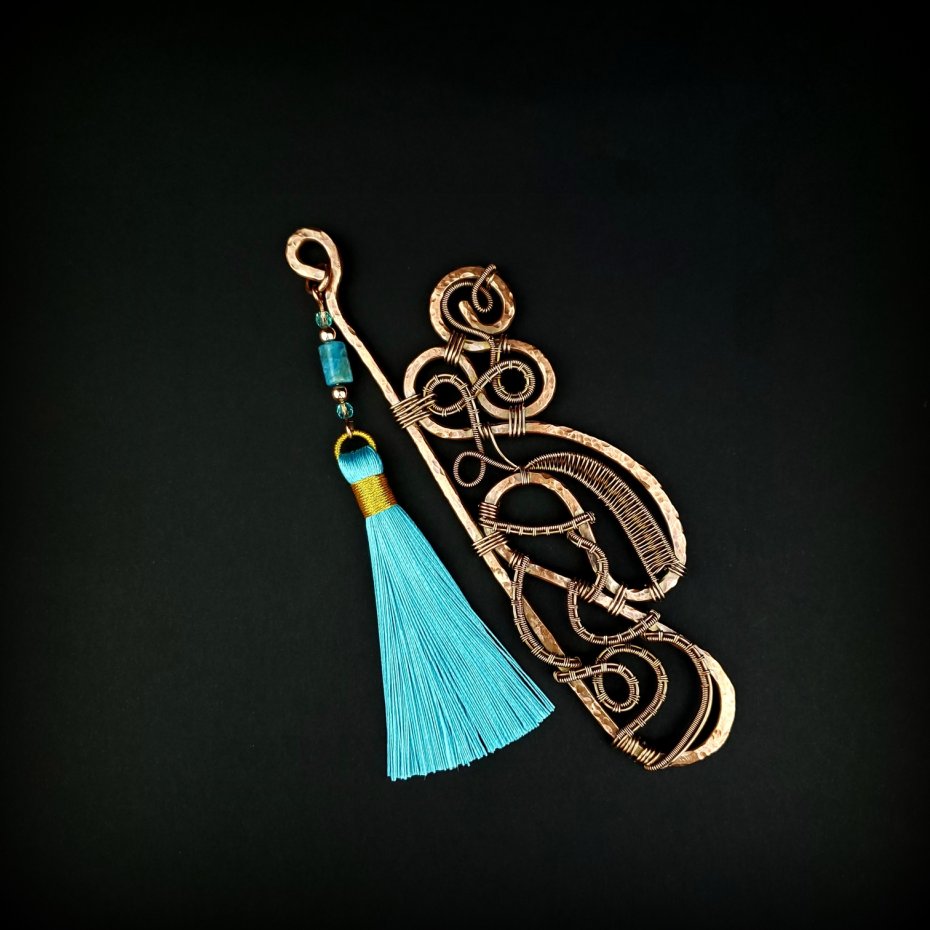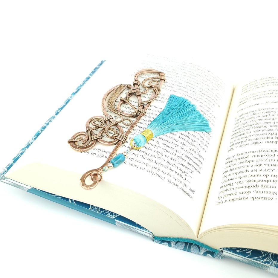 Jedyna w swoim rodzaju zakładka do książki wykonana w pracochłonnej technice wire wrapping. Zakładka wykonana z fakturowanej miedzi, z misternym oplotem. Ozdobna przywieszka z długim wiskozowym chwostem w kolorze błękitnym oraz kamieniami: apatytem i hematytem. Całkowita długość zakładki to 16 cm.