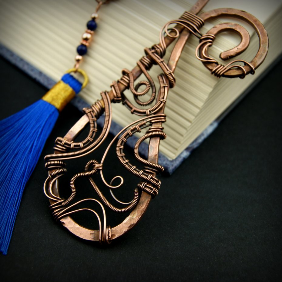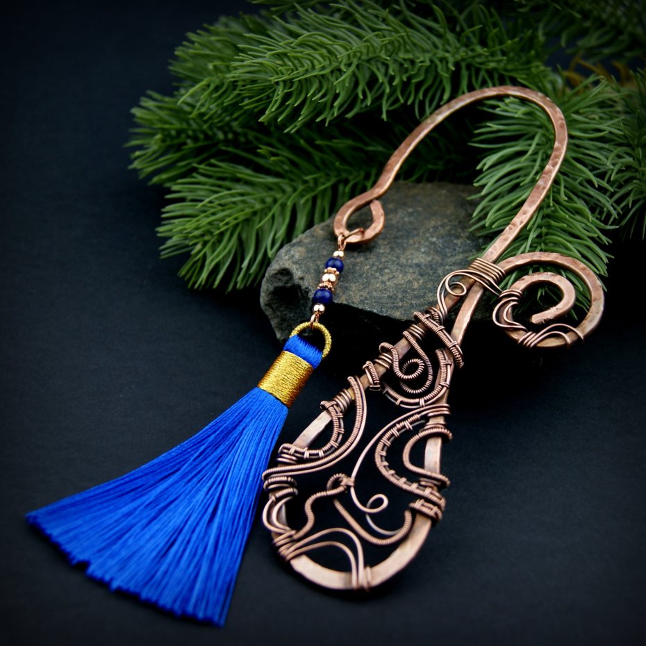 Jedyna w swoim rodzaju zakładka do książki wykonana w pracochłonnej technice wire wrapping. Zakładka wykonana z fakturowanej miedzi, z misternym oplotem. Ozdobna przywieszka z długim wiskozowym chwostem w kolorze niebieskim oraz kamieniami: lapis lazuli i hematytem. Całkowita długość zakładki (razem z chwostem) to 17,5 cm.