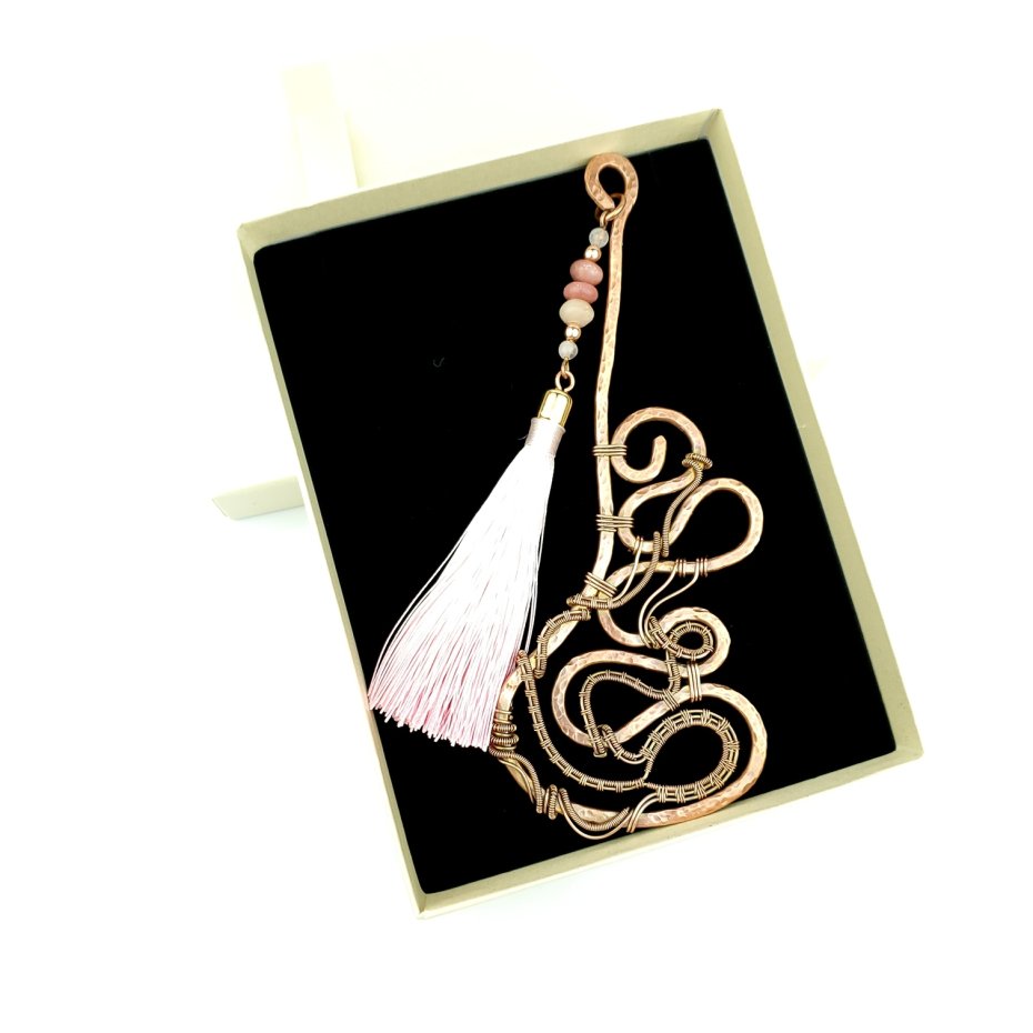 Jedyna w swoim rodzaju zakładka do książki wykonana w pracochłonnej technice wire wrapping. Zakładka wykonana z fakturowanej miedzi, z misternym oplotem. Ozdobna przywieszka z długim, cieniowanym wiskozowym chwostem w kolorze różu oraz kamieniami: opalem i hematytem. Całkowita długość zakładki to 16 cm.