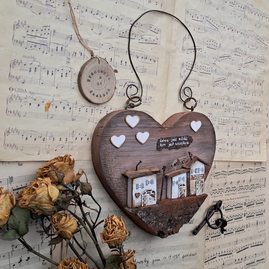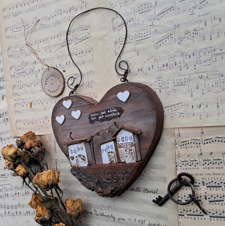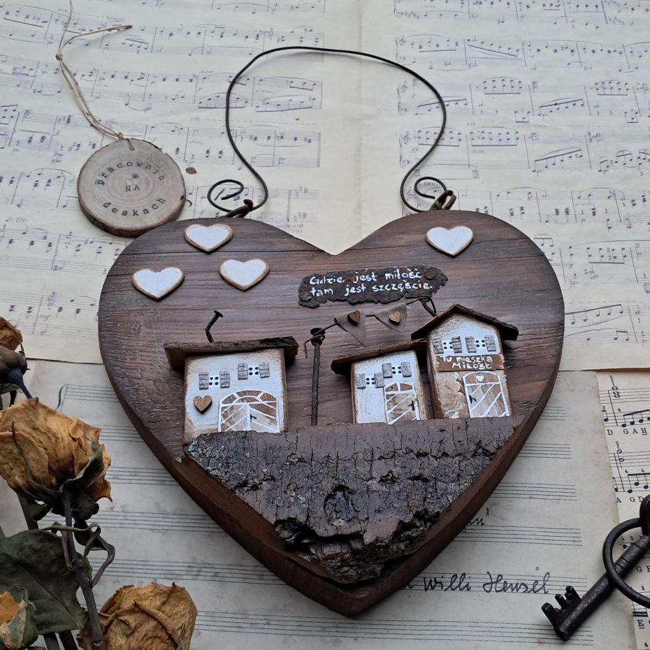 Drewniane ozdobne serce do powieszenia z domkami 3 D, wykonane z drewna, malowane, patynowane, może stanowić niebanalną ozdobę Twojego domu. Zawieszone w kuchni, pokoju lub na drzwiach pięknie będzie się prezentować... Serce może być również niebanalnym prezentem na walentynki, do nowego domu, dla bliskiej osoby.