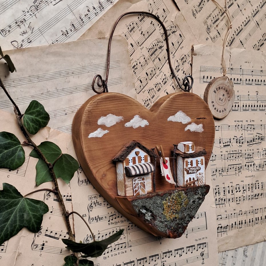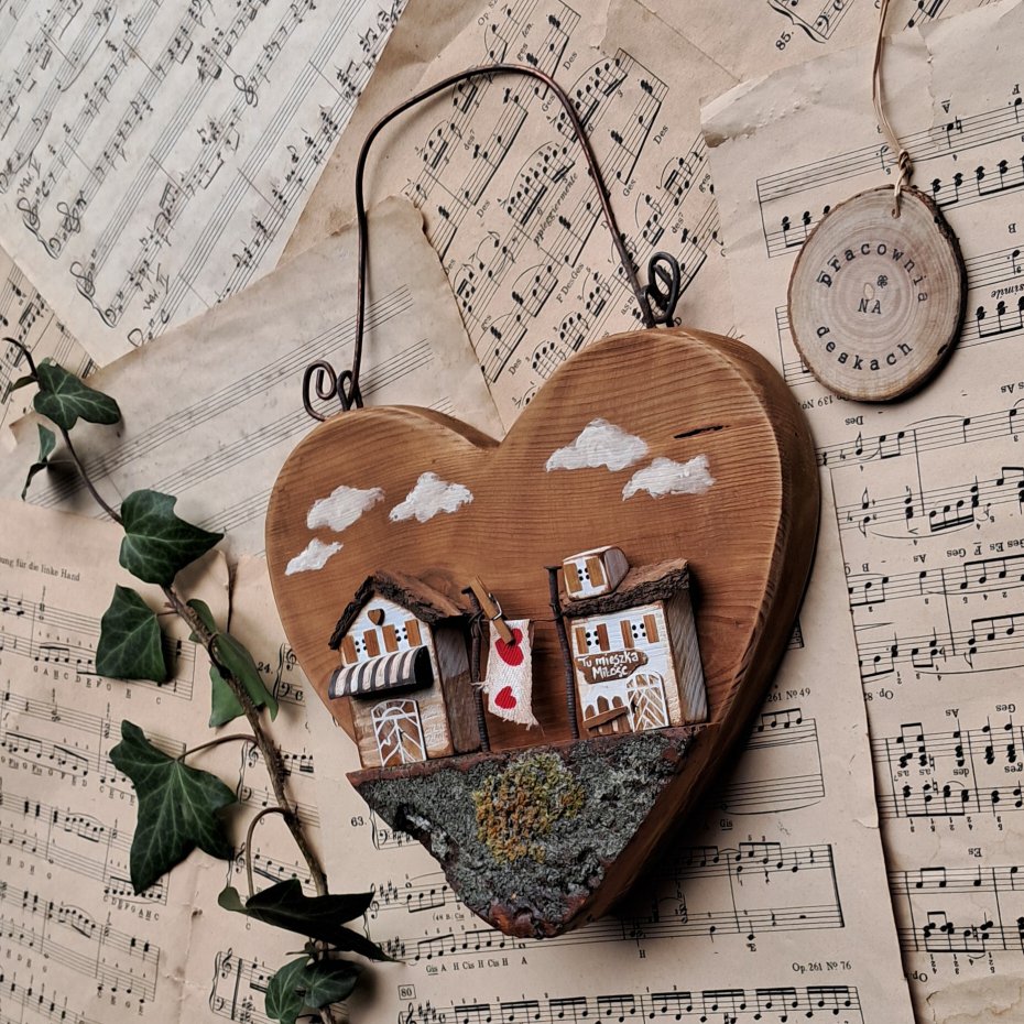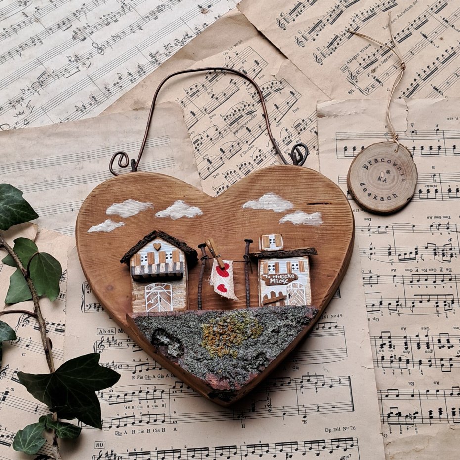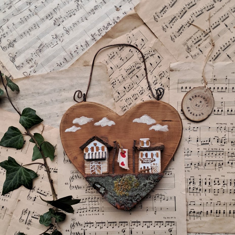 Drewniane ozdobne serce do powieszenia z domkami 3 D, wykonane z drewna, malowane, patynowane, może stanowić niebanalną ozdobę Twojego domu. Zawieszone w kuchni, pokoju lub na drzwiach pięknie będzie się prezentować... Serce może być również niebanalnym prezentem na walentynki, do nowego domu, dla bliskiej osoby, prezen dlamamy ,przyjaciółki lub ulubionej nauczycielki.