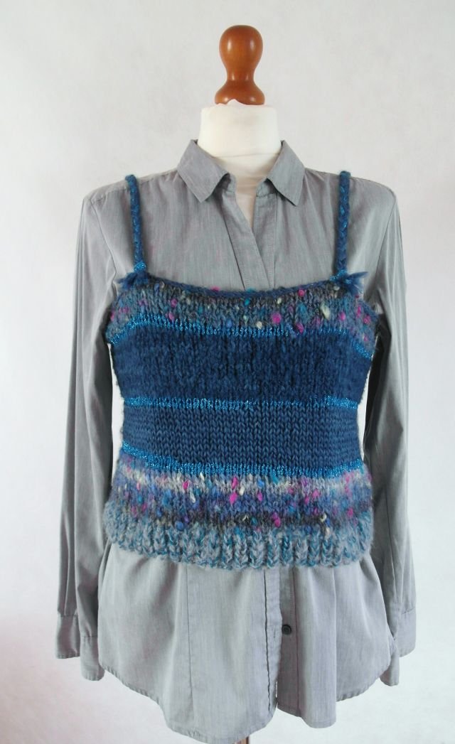 ciekawy kolor - zgaszony ciemny morski, przetykany różowymi supełkami oraz metalizowaną turkusową włóczką.Ramiączka splecione w warkocz.