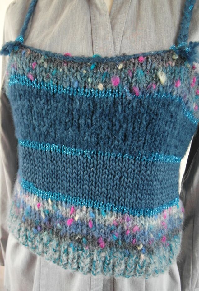 ciekawy kolor - zgaszony ciemny morski, przetykany różowymi supełkami oraz metalizowaną turkusową włóczką.Ramiączka splecione w warkocz.