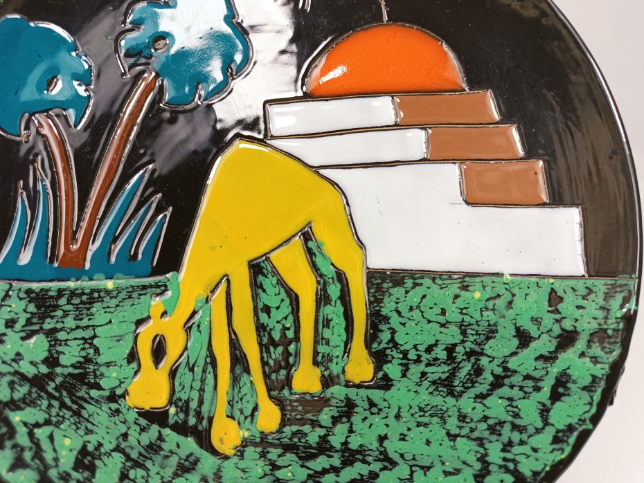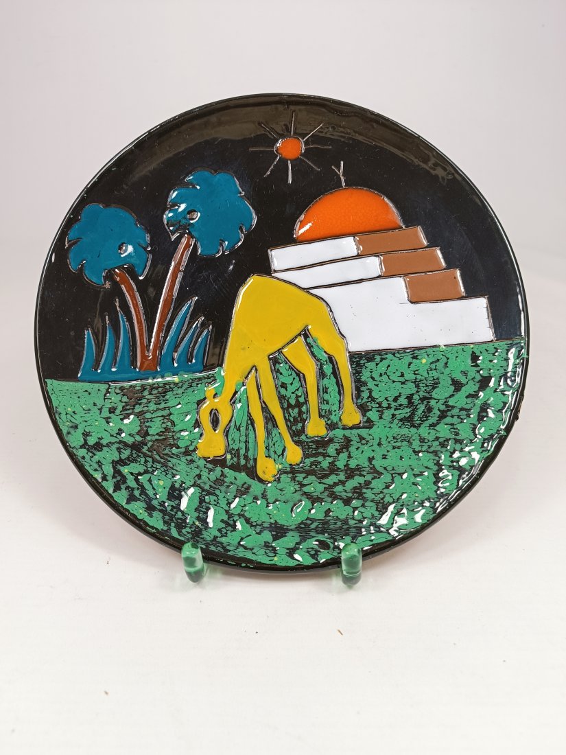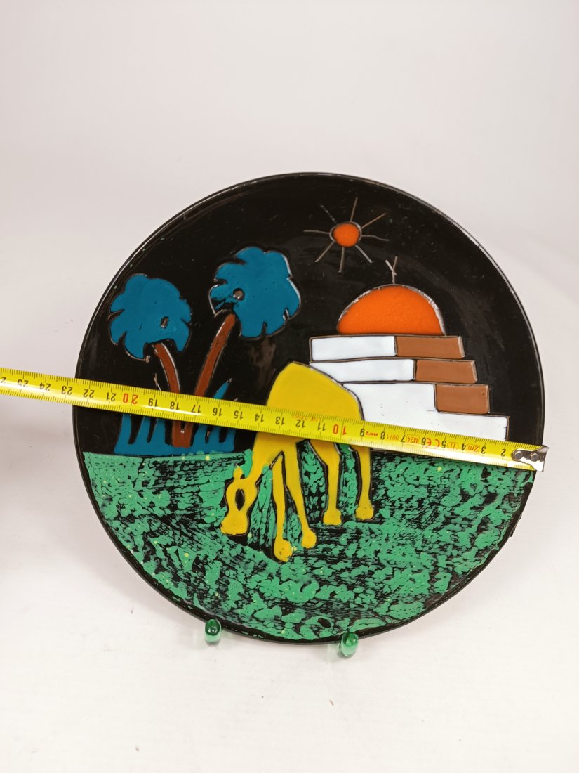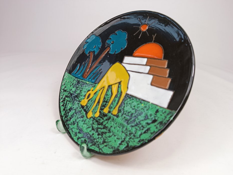 Ręcznie malowany ozdobny talerz ścienny z wielbłądem, vintage. Szkliwiony. Stan zachowania bardzo dobry, bez uszkodzeń.