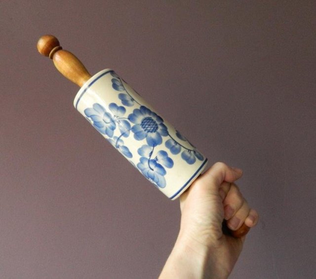 WŁOCŁAWEK (zapewne) - stary ozdobny wałek kuchenny z drewnianymi rączkami. Ceramika ręcznie malowana.