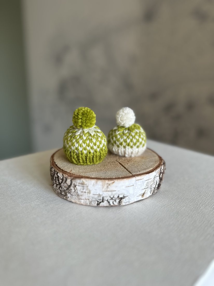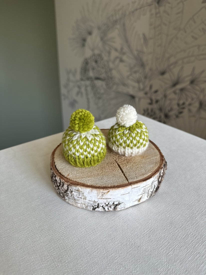 Zestaw 2 szt. zawieszek choinkowych, mini-czapeczek, wykonanych ręcznie na drutach z wełny owczej.