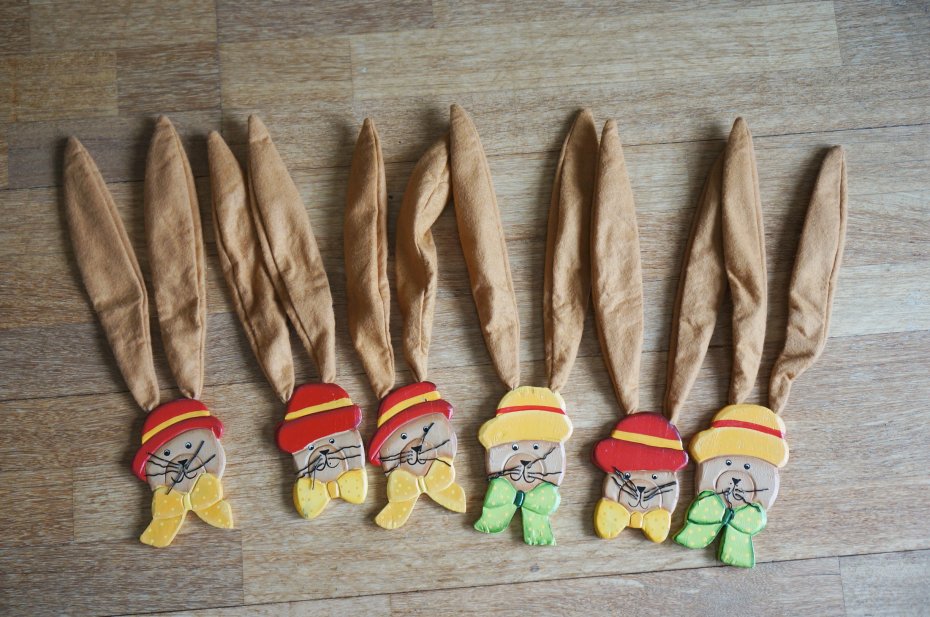 Sześć zajączków . Główki wykonane z drewna. Uszy z tkaniny i drutu który można wyginać w zależności od potrzeb.