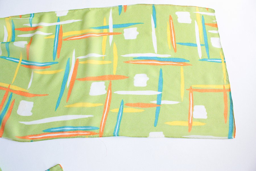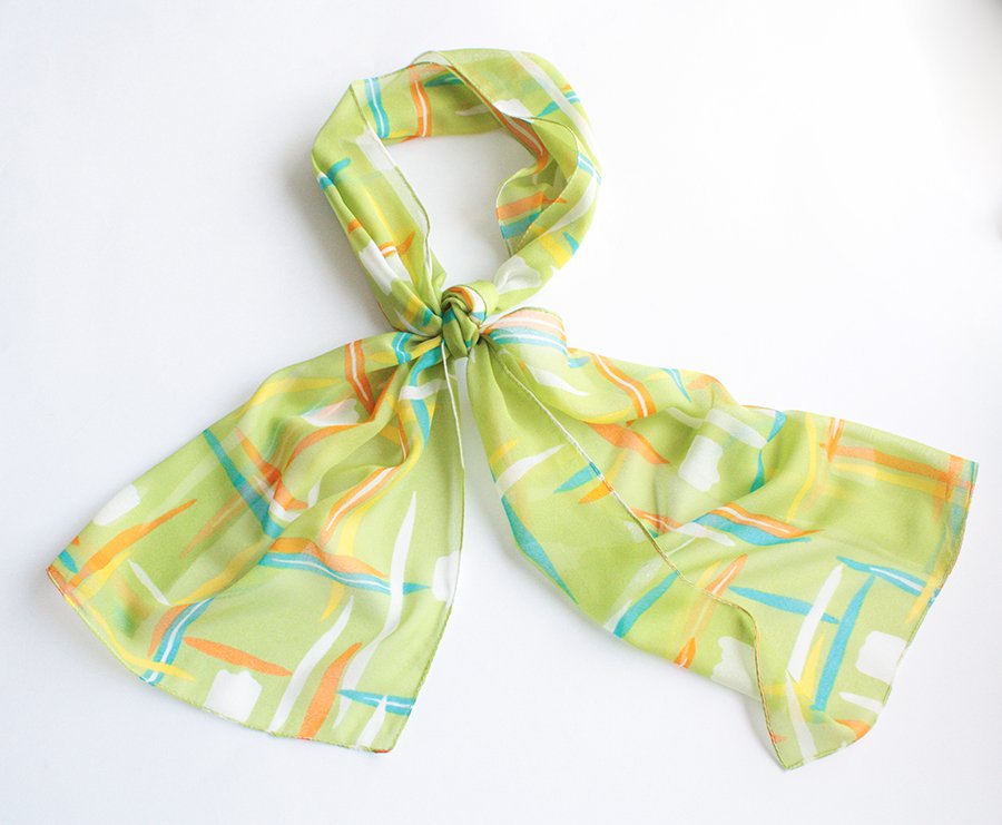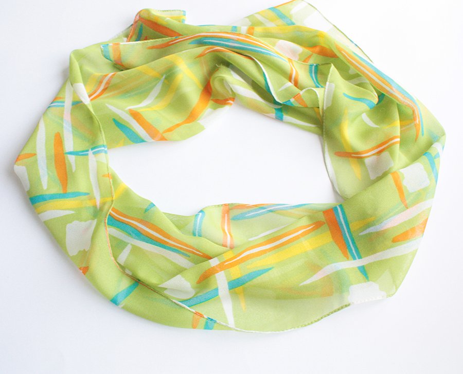 Zwiewny szal w kolorze limonkowym. Materiał to prawdopodobnie poliester.