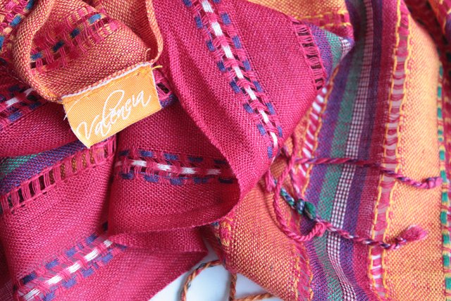 Wielobarwny, ożywiający stylizację szal w pasy, o ciekawej, miejscami ażurowej strukturze. Wykonany prawdopodobnie z wiskozy.