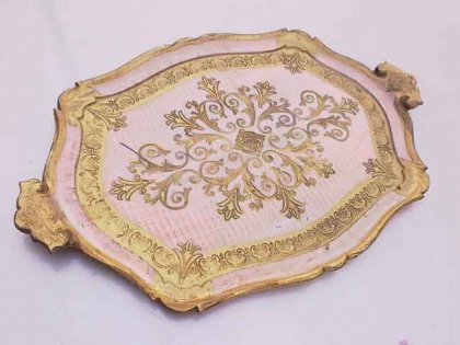Wyjątkowo elegancka drewniana taca, Made in Italy. Bogactwem nasycone złocenie i pastelowy pudrowy róż. Fantastycznie ekskluzywne barw spotkanie :) Szykowna i z klasą :) Długość 60; szer. 39; wys. 3 cm. Stan zachowania bardzo dobry.